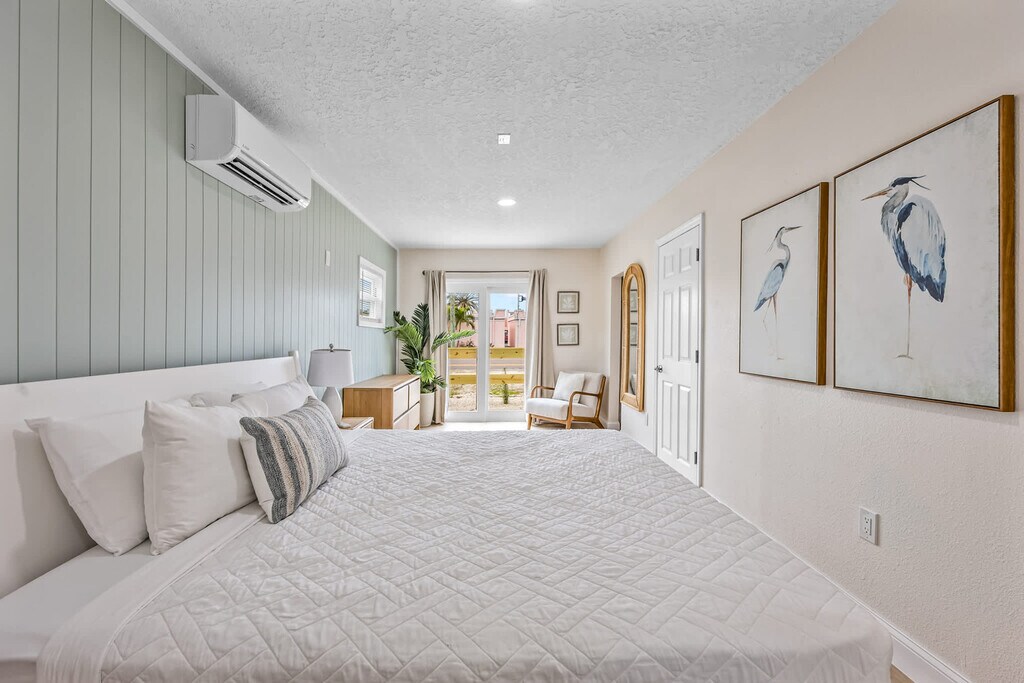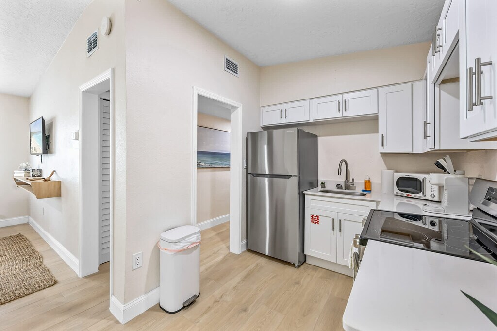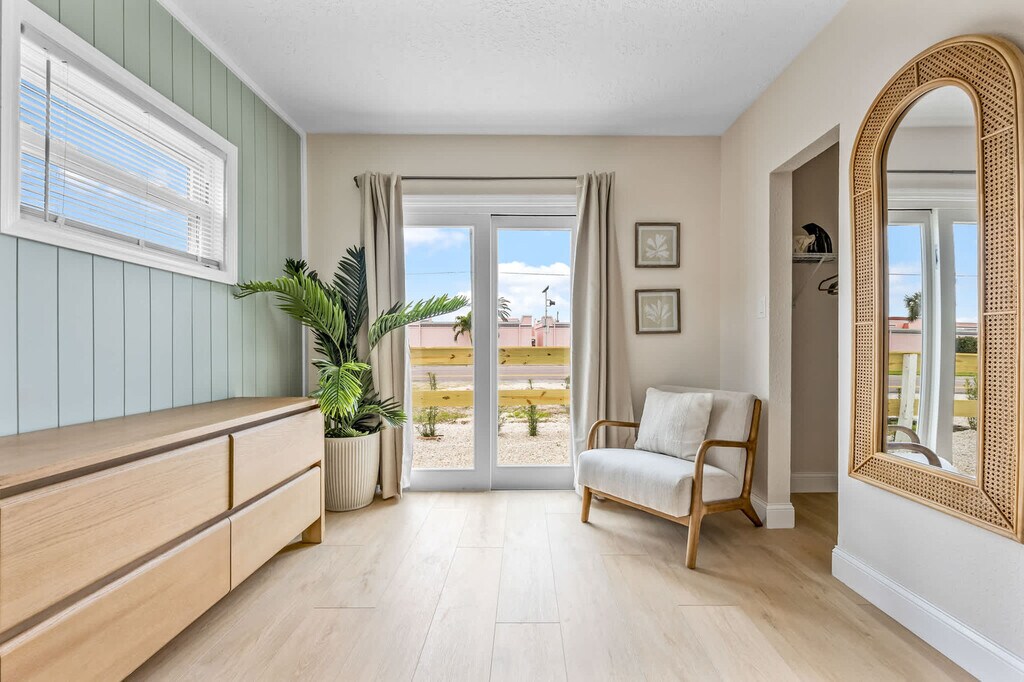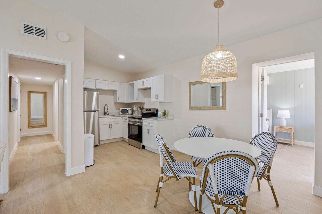 Welcome to The Drift, a beautifully updated beachside multi-unit complex that perfectly blends modern comfort with coastal relaxation. Ideal for all types of travelers, from honeymooners and families to remote workers and groups of friends, this stylish space is tailored for your convenience and enjoyment. Enjoy a comfy king-size bed, a fully equipped kitchen or kitchenette, a dining area, and high-speed Wi-Fi. Beach essentials are provided, and the beach is just 700 ft away! This thoughtfully designed two-bedroom unit is your personal slice of paradise, featuring a plush king-size bed, a full kitchen, and a cozy dining space—perfect for enjoying your fresh catch of the day. With speedy Wi-Fi and refreshing air conditioning, you’ll stay as chill as the ocean breeze. Kickstart your day with a 2-minute stroll to the beach, and all the essentials are waiting—beach chairs, umbrellas, and carts to make your seaside lounging effortless. After soaking up the sun, wander just six blocks to downtown Cocoa Beach, buzzing with lively restaurants, cool bars, and fun local attractions. Don't forget to look up—those rocket launches are a sky-high spectacle you’ll never forget! On-site parking makes exploring the area stress-free—just load up and head out to discover Cocoa Beach’s many treasures. While we love all furry friends, only dogs are allowed at this property, with a fee of $100 per pet per stay. Experience the best of both worlds in this prime location. Just a quick 5-minute walk to the golden shores of Cocoa Beach and close to the heart of downtown. Indulge in mouthwatering delights at the fantastic local restaurants or catch a thrilling rocket launch nearby. For those seeking adventure, the area offers a plethora of attractions to explore. Although there is so much to walk to, Uber and Lyft are very prevalent in the area. Convenient scooter rentals are available nearby to explore Cocoa Beach with ease. You’ll have full access to your private unit and shared outdoor amenities. Complimentary beach equipment is provided for guests to enjoy during their stay. All beach gear is communal and available on a first-come, first-served basis. Guests are kindly asked to return items after use so everyone can enjoy them. Beach equipment is not guaranteed, so if you have specific needs, bringing your own is recommended. Mid-term cleaning services are offered to keep your unit fresh throughout your stay. A laptop computer is not included. Mailbox access is not available for guests. All reservations require either a refundable security deposit or the purchase of a damage waiver.