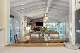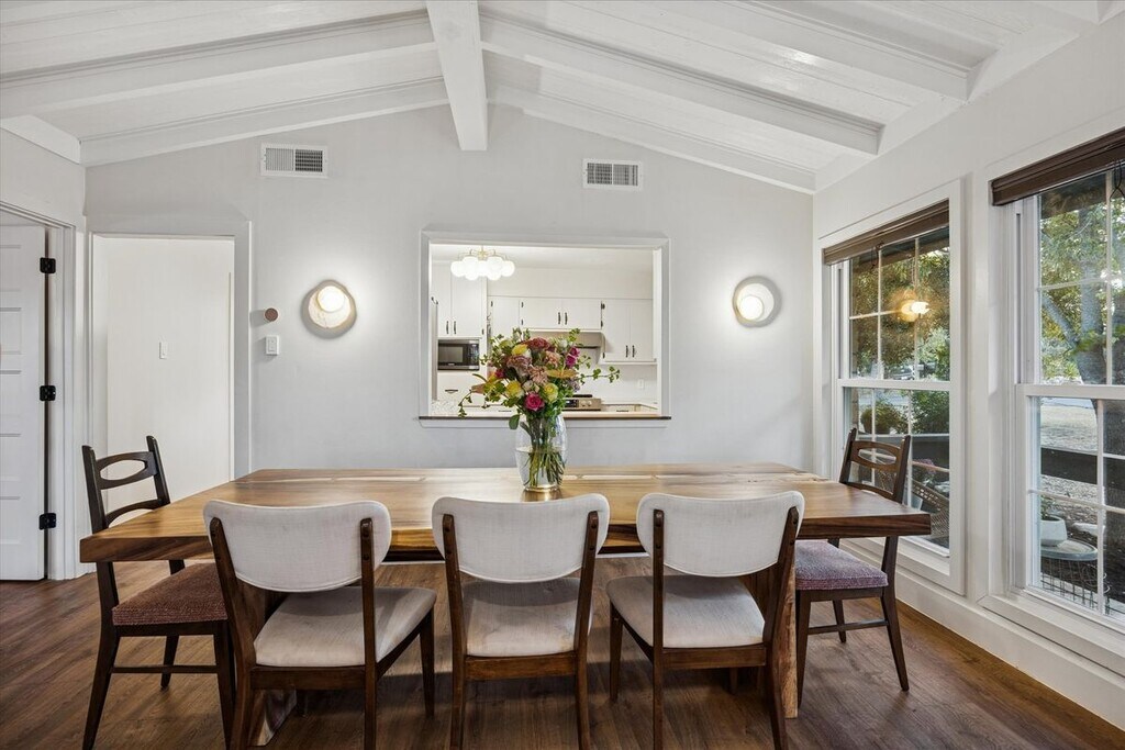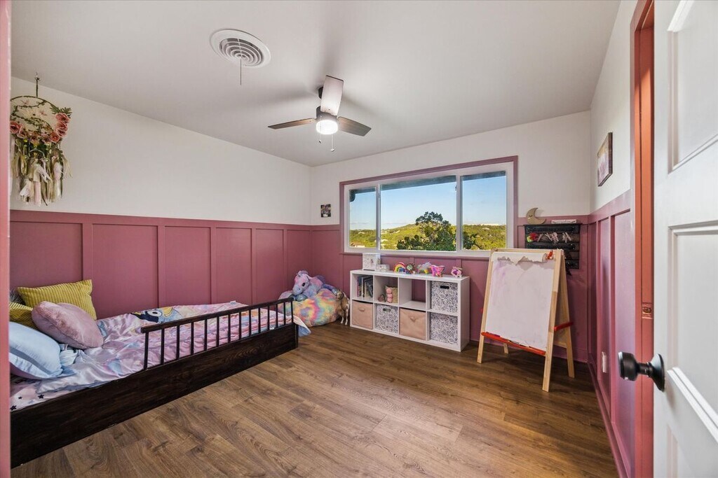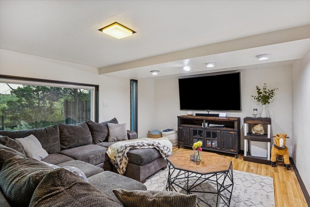 This restored mid-century bungalow sits on a premium oversized corner lot just two blocks from the lake and marina, and only minutes from schools and 1431. Thoughtfully updated while preserving its 1959 charm, this 4-bedroom, 3-bathroom home offers 2,415 sq ft of light-filled living with panoramic Hill Country views that stretch for miles. The main level welcomes you with an inviting open-concept living and dining space, anchored by a stunning rose-quartz stone fireplace and framed by vaulted ceilings and expansive picture windows overlooking the hills. The stonework extends across the living area, creating an organic, grounded feel enhanced by warm-toned luxury plank flooring throughout. The kitchen features stainless steel appliances (with optional dual-ice refrigerator), ample cabinetry, and a charming garden window—perfect for your favorite plants. All three upstairs bedrooms offer sweeping views, while the primary suite includes a private bath with shower/tub combo. The recently renovated guest bath showcases a deep-soaking tub, floor-to-ceiling designer tile, quartz countertops, and a custom double vanity. A custom built-in mudroom with cabinetry, bench seating, and thoughtful storage maximizes function and design. The laundry room includes additional cabinetry, shelving, and a pull-down ironing board, with optional washer and dryer included. Downstairs, a flexible second living area with large picture windows can serve as a game room, art studio, or guest retreat, complete with a private bedroom with walk-in closet and full bath nearby. Outside, a gorgeous front porch and back deck offer space for relaxation, with a two-car garage and expansive driveway providing plenty of parking. Residents enjoy access to Lago Vista POA amenities, including multiple waterfront parks, boat ramps, optional pool/gym, and more—all in a peaceful, lakeside setting. Experience timeless design, modern comfort, and Hill Country tranquility all in a beautifully updated nature space. MLS ID 2574934