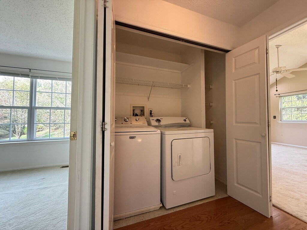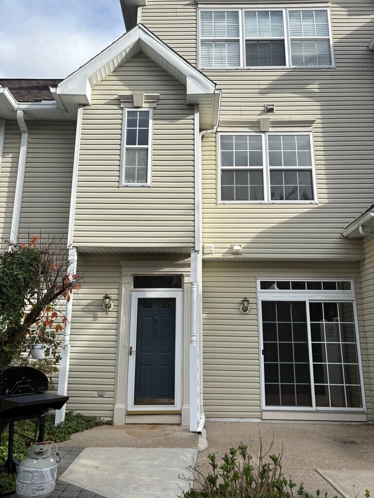 Welcome to this beautifully maintained Chelsea Model, end unit townhome in the desirable Rose Arbor community. Filled with natural light, this sunny and bright home features a first-floor entrance that opens into a spacious living and dining area, highlighted by large, picturesque windows and gleaming hardwood floors. The updated eat-in kitchen offers direct access to a private patio through sliding glass doors perfect for relaxing or entertaining. An attached one-car garage conveniently opens into the kitchen . A stylish powder room completes the main level. Upstairs, you will find two generously sized bedrooms, each with its own en-suite bathroom, providing comfort and privacy. A hallway laundry area with washer and dryer adds convenience to the second floor. The full, finished basement offers flexible space for a home office, recreation room, gym, or additional storage. Quiet, private, and move-in ready, this charming townhome is a wonderful place to call home.