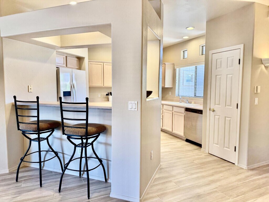 This property comes lightly furnished or not- your call! New washer/dryer and fridge along with a new fresh paint! Welcome to the Vistoso Resort Casitas in Rancho Vistoso. This charming two-bedroom, two-bathroom condo with an additional den is located on the first floor, offering easy access and beautiful views of the Catalina Mountains from your private patio. Ideal for long-term stays of one year or more, this fully furnished casita provides a comfortable and welcoming environment.This property is lightly furnished and comes with a brand new washer/dryer and fridge! The property was also just painted, had a ceiling fan in the second bedroom replaced and a toilet in the second bathroom replaced.The master suite includes a king-sized bed and an en-suite bathroom with a walk-in shower. The second bedroom has two twin-beds. The den offers a queen bed and tv.