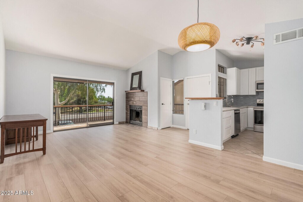 2 bed 2 bath condo,2nd floor unit in Maryland Lakes! Close to GCU. Great for Students,first time homebuyers,or retirees. Notice vaulted ceilings,a fresh,neutral palette,stylish vinyl plank flooring,and an inviting fireplace for cozy evenings. The new,updated kitchen comes with abundant white shaker cabinets,a tile backsplash,stainless steel appliances,a pantry,and a two-tier peninsula with a breakfast bar. The main bedroom offers a private bathroom for added comfort. Imagine peaceful afternoons on the balcony,complete with boardwalk style decking. The balcony also has a storage nook. Great views of the nice Greenbelt across the street with mature trees and green grass. Covered carport parking directly below the unit.