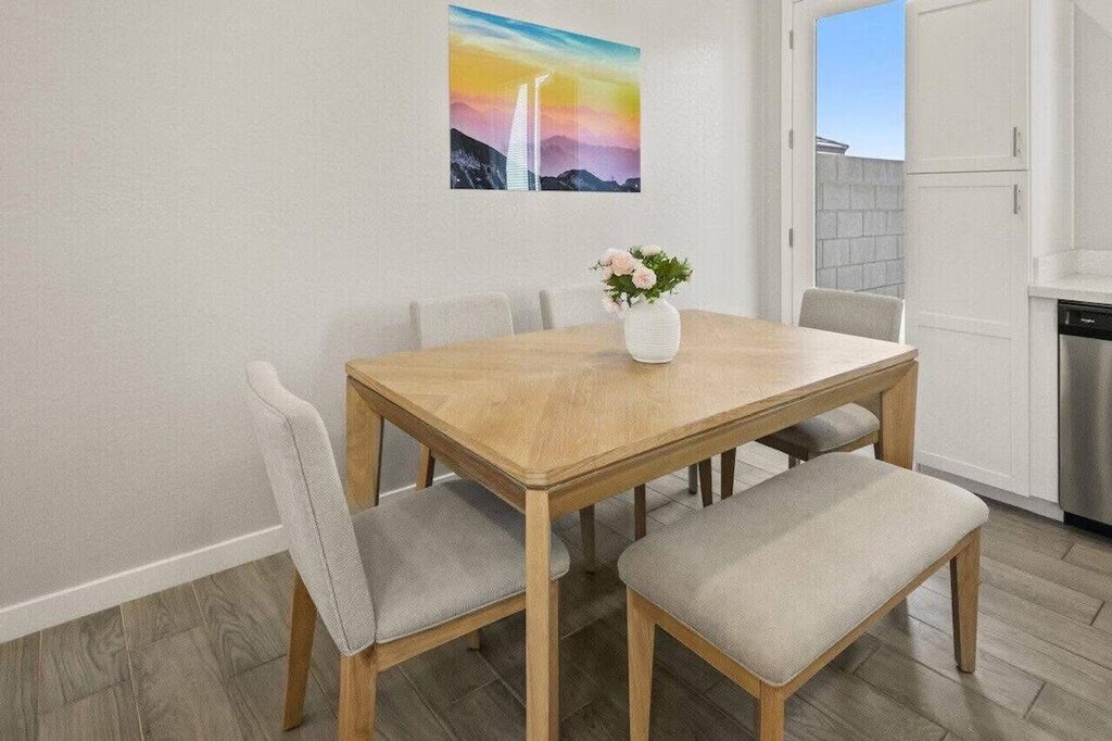 Feel at home in this stylish and spacious retreat in the heart of Glendale. This modern 2-bedroom, 2-bathroom apartment offers family-friendly comfort and style. The open-concept living and dining area features wood accents and contemporary finishes. The fully stocked kitchen includes a stove, oven, fridge, microwave, dishwasher, coffee maker with coffee essentials, toaster, kettle, full dinnerware, cookware, and baking trays. The bathrooms are well-equipped with a shower, bathtub, toilet, sink, mirror, towels, hairdryer, and essential toiletries. Enjoy plush bedding, black-out curtains, a 70" 4K smart TV in the living room, and an in-unit washer and dryer. An air mattress is available, but does not include bedding. A foldable crib is also available. This apartment is centrally located near State Farm Stadium, Westgate, Topgolf, shopping, dining, and major roads, making it perfect for weekend trips, extended stays, and game days. A Minut noise monitoring device is in the unit. Essentials are provided in a starter quantity only and are not unlimited. Toiletries and other consumable supplies are provided as a one-time set-up at check-in, and refills or replacements are not offered during your stay. Interior photos represent the layout and style, but individual units may vary slightly in furnishings or orientation. [SI]