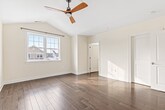 This home features hardwood floors on the main level, an open-concept layout, and a private patio. The kitchen is appointed with granite countertops, stainless steel appliances, recessed lighting, and ample cabinetry. The living area includes a slider to outdoor space, perfect for relaxing or entertaining. Upstairs you'll find two generously sized bedrooms including a primary suite with cathedral ceiling and walk-in closet, a full bath with double vanity, and a versatile loft ideal for a home office or additional lounge space. In-unit laundry and central air complete the package.