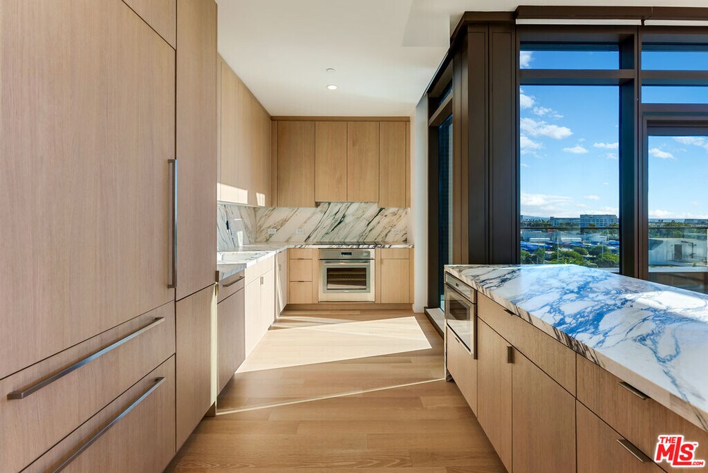 700 Broadway - Santa Monica's Most Glamorous Penthouse Collection - Penthouse 815 at 700 Broadway is a rare corner three-bedroom, two-bath residence offering refined luxury, architectural volume, and an expansive private terrace with partial Pacific Ocean views. Soaring 10-foot ceilings, wide-plank flooring, and dramatic floor-to-ceiling glass create a light-filled sanctuary with seamless indoor-outdoor flow. The chef's kitchen is a study in sophisticated design, appointed with Calacatta Monet marble countertops and full-height backsplash, custom oak cabinetry with integrated under-cabinet lighting, and a full suite of Thermador Smart Home appliances, including a wine refrigerator and microwave drawer. Spa-caliber bathrooms feature oak vanities, Cielo quartzite counters, Taj Mahal porcelain tile, and finely crafted Dornbracht fixtures, evoking a serene, resort-inspired atmosphere. Thoughtful upgrades include motorized roller shades, Nest thermostat, Lutron dimmable lighting, customizable Elfa closets, side-by-side LG washer and dryer, and secure keyless entry. Residents enjoy an unrivaled lifestyle with a 24/7 attended lobby boasting soaring double-height ceilings, on-site valet parking, and premier retail including Equinox Fitness Club and an upscale grocer. Amenities rival those of a private members' club, featuring a lush 3/4 acre landscaped park with fire pits and outdoor dining, co-working lounge and library, entertainment lounge with bar and demonstration kitchen, indoor-outdoor fitness pavilion, speakeasy lounge with poker room, bowling alley, private screening room, pet spa, and a resort-style pool deck with 75-foot lap pool, hot tub, cold plunge, barrel saunas, reservable outdoor entertaining suites, and a rooftop dog run. MLS# 25621923