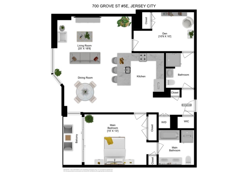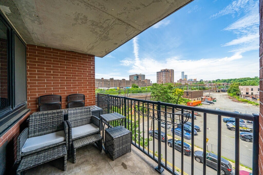 Beautiful and spacious 1-bedroom plus Den, 2 bath home with a private balcony in luxury community of 700 Grove St. The south facing exposure and open floor plan provides an abundance of natural light. Chef's kitchen features granite countertops, stainless steel appliances and breakfast bar. Primary bedroom has two walk-in closets and an ensuite bath. The home also includes custom entertainment center, hardwood floors, and in-unit washer/dryer. The exclusive community includes 24/7 doorman, shuttle to the Path, gym, community room, shared courtyard with BBQs, and playroom. Move in 02/01/2026.