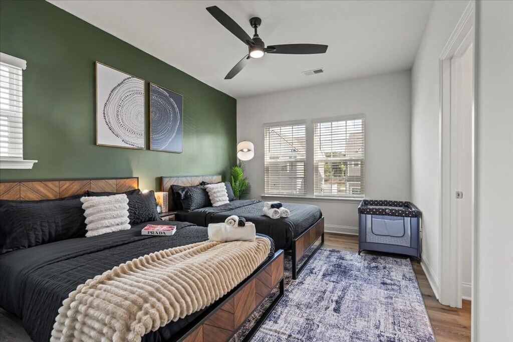 Stay in style in the eclectic city of Charlotte, home to the second largest banking center in the USA. This classy 1610 sq. ft. 3-bedroom and 2.5-bathroom townhouse features three king-size beds for your comfort, lightning-fast Wi-Fi, a convertible sleeper couch, and a fully equipped kitchen. Specially designed for longer-length stays, step out to a lively neighborhood just minutes from Uptown Charlotte, with restaurants, cafés, bars, and shops just steps away. Begin your day with a perfectly brewed cup of tea or coffee from the convenient coffee station in your upscale kitchen. Whether you're here for business or leisure, this space is designed to provide the perfect balance of comfort and convenience. With vibrant restaurants just minutes away, explore the culinary scene in Charlotte each night. After a long day, your well-equipped kitchen and elegant dining table are ready to provide a 5-star dining experience right at home. This space serves as the perfect home base for work, relaxation, and entertainment. Step inside and discover an inviting open-concept living area, elegantly furnished to provide a blend of relaxation and functionality. Large windows flood the space with natural light, while modern décor and high-end finishes create a sophisticated yet comfortable atmosphere. We welcome up to two pets per reservation, each weighing under 35 lbs, with a fee of $49 per pet for stays of 1–6 nights. Additional charges apply for longer stays. For pets over 35 lbs, a one-time large pet fee applies. Bringing undisclosed pets may result in a minimum $500 fine and cancellation of your stay without refund. Early check-in and late checkout are based on availability, with fees applicable for extended hours. Optional mid-stay cleaning is available for extended stays, including new linens, surface cleaning, and trash removal. Situated in a vibrant neighborhood, this property places you within minutes of top attractions, dining, and nightlife. Enjoy easy access to the NASCAR Hall of Fame, Discovery Place Science, Carowinds Amusement Park, Billy Graham Library, U.S. National Whitewater Center, Spectrum Center, SouthPark Mall, Bank of America Stadium, Camp North End, NoDa (North Davidson Arts District), Plaza Midwood, and Freedom Park. Private garage parking and driveway accommodate up to (# OF CARS). Public transit and ride shares are readily available, offering quick access to Uber, Lyft, and local transit. Quiet hours are enforced from 8:00 PM to 8:00 AM, and noise levels exceeding 80 decibels for more than 10 consecutive minutes may result in a $2,500 fine and immediate removal from the property. Smoking is strictly prohibited anywhere on the premises, and tampering with smoke detectors will incur a $2,500 fine and immediate removal. Unauthorized guests will result in a $500 fine per person, immediate removal, and cancellation of the reservation without refund. All guests must complete identity verification prior to check-in, and the primary guest must be at least 21 years old. Smart lock access details will be shared prior to check-in, and guests are expected to follow instructions provided in the Guest Portal. This townhouse is perfect for business travelers with high-speed Wi-Fi and a dedicated workstation featuring a standing desk, ideal for remote work. The spacious living area is thoughtfully designed with plush seating, a 55” Smart 4K TV, and elegant décor, making it perfect for streaming, remote work, or video calls. [SI]