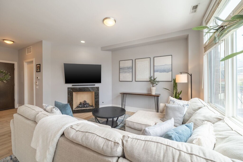 Leslie MartinezExquisite River West 2 bed/2.5 bath penthouse in boutique elevator building! This 1,545 sqft contemporary floor plan is an entertainer's dream with soaring ceilings, unobstructed Southern & Eastern skyline views throughout & French doors opening onto private 450 sqft rooftop terrace. Upgraded kitchen features two-tone cabinetry, stainless steel appliances, wine fridge & granite breakfast bar. Spacious living & dining room, sophisticated powder room, dark hardwood floors, skylights, gas burning fireplace, laundry room with side-by-side washer/dryer & ample storage. Oversized master bedroom with walk-in closet & ensuite marble bath with glass enclosed shower, jetted tub & double vanity. Second bedroom with Southern exposure & second bath with luxe tile & skylight. Located on the cusp of the West Loop! Walk to East Bank Club, The Dawson, Starbucks & Fulton Market! Across the street from Grand Blue Line, easy access to 90/94. Additional storage & premium heated garage parking included. Dogs Only.