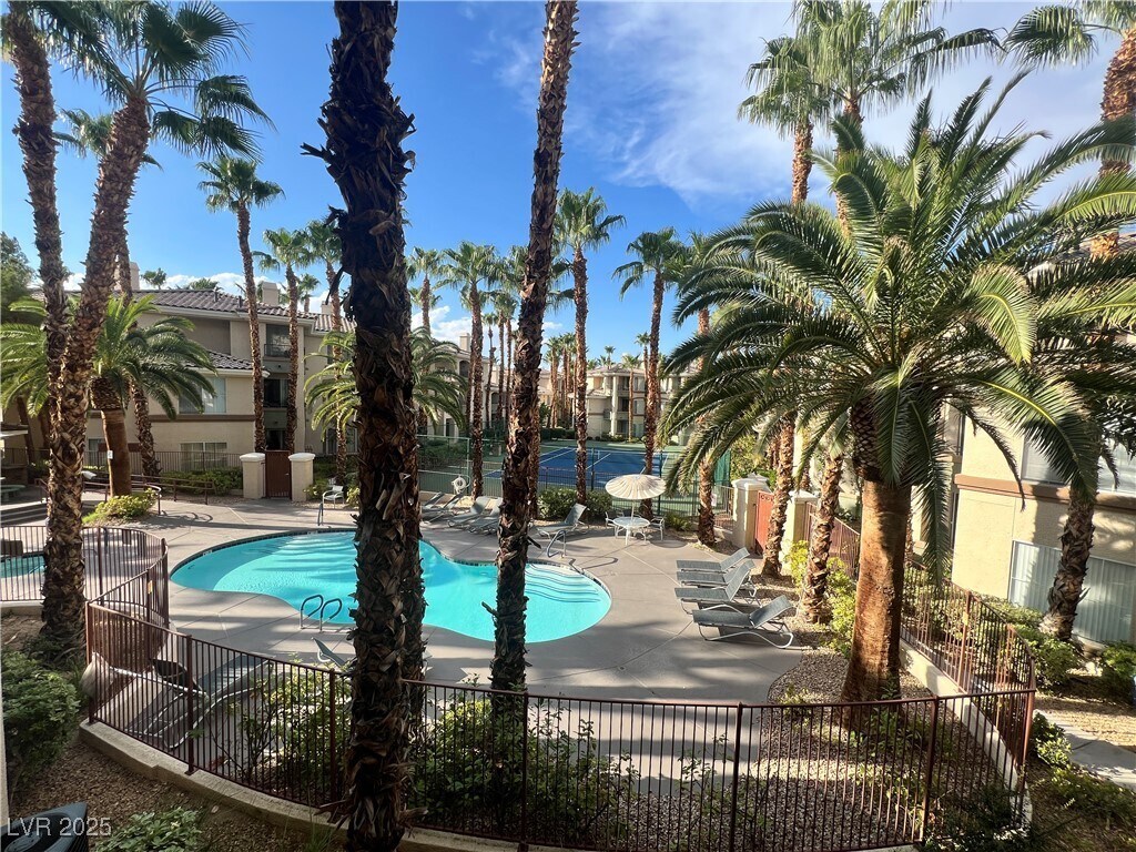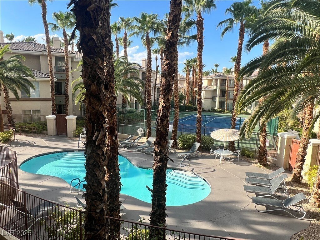 Welcome to Vistana Fully Furnished charming 2-Bed, 2-Bath condo on the second floor offers a cozy living space located in a great guard-gated community with 24-hour security, residents can enjoy numerous amenities including a clubhouse, several pools, BBQ areas, guest parking, a tennis court, and an exercise room with a sauna. This condo is in an excellent location, close to shopping centers (including Ikea!), freeways, restaurants, banks, and the Strip, making it an ideal place to call home. Living room features a fireplace and opens up to a balcony, perfect for relaxation steps away from The Posh Durango Resort & Uncommons Shopping Center , 2 minutes from 215 freeway giving you access to Henderson, Summerlin, The Strip & Airport within a 15 min drive. Unit has pool and tennis court views!!!