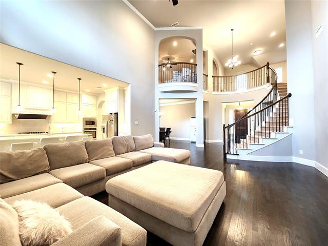Welcome to this stunning 5 bedroom, 4 bath home offering nearly 4,524 square feet of living space in the Phillips Creek Ranch community. The home features an open concept design with high ceilings, hardwood floors, and abundant natural light. Main features include a dramatic staircase and foyer, private office or study with French doors, a main floor guest bedroom with full bath, spacious living room with corner stone fireplace and wall of windows, formal and casual dining areas, and a gourmet kitchen with oversized island, quartz countertops, custom cabinetry, gas cooktop, Whirlpool ovens, butler pantry, and large walk in pantry. The primary suite offers a soaking tub, frameless glass walk in shower, dual vanities, and an oversized walk in closet. A large laundry room with sink and a three car garage complete the main level. Upstairs features a large game room, a spacious media room, a loft area suitable for recreation or additional seating, three additional bedrooms, and two full baths. Community amenities include two swimming pools with one nearby, a fitness center with no membership fee, nearby schools within walking distance, community events throughout the year, lakes for fishing, parks, and over 100 acres of green space with paved hike and bike trails. Outdoor features include a covered patio and backyard with space for relaxation or entertaining. Conveniently located minutes from Dallas North Tollway, The Star, Shops of Legacy, PGA, and Grandscape.