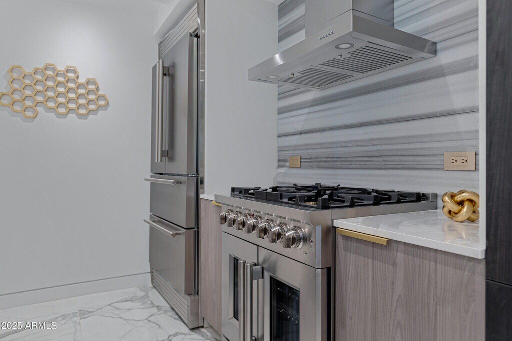 Don't miss this rare opportunity to lease a beautifully remodeled 2-bedroom,2-bath residence in the heart of Scottsdale. Elegant marble flooring,striking gold accents,and a modern chef's kitchen with premium appliances set the tone for refined living. The open-concept design features a cozy fireplace,spacious dining area,and a beautiful patio with tranquil pool views. The generous primary suite is a true retreat with dual closets and a spa-like bath complete with double vanities and a luxurious multi-head shower. Upscale finishes,thoughtful details,and an unbeatable location near Scottsdale's top dining,shopping,nightlife,and entertainment make this condo a rare rental offering for those seeking elevated desert living with both comfort and style.