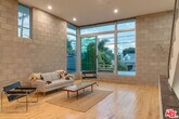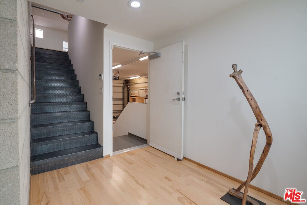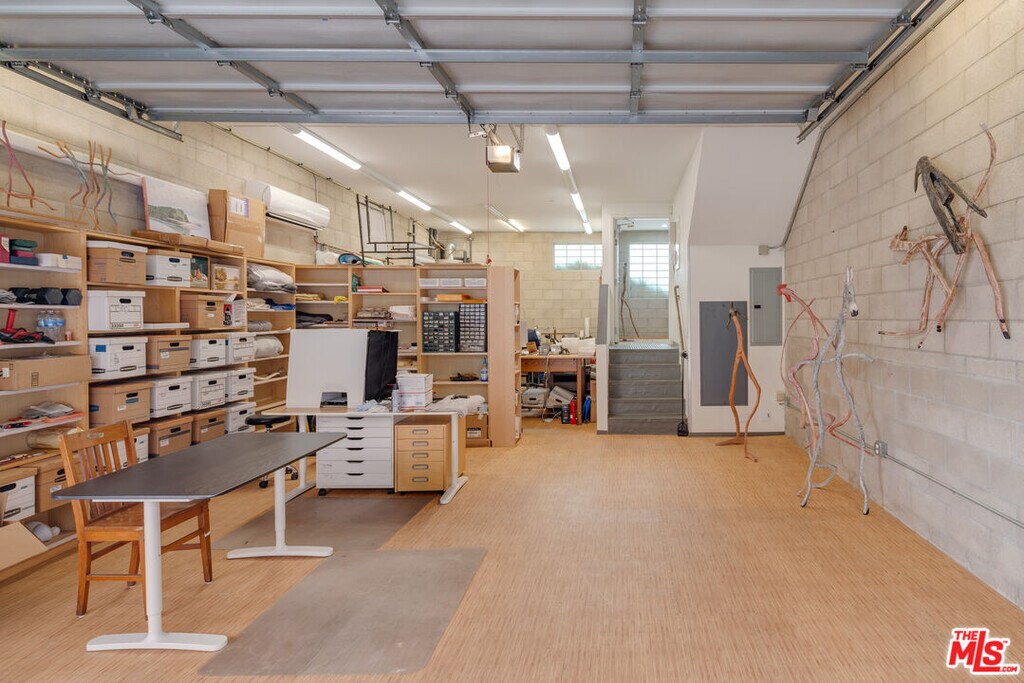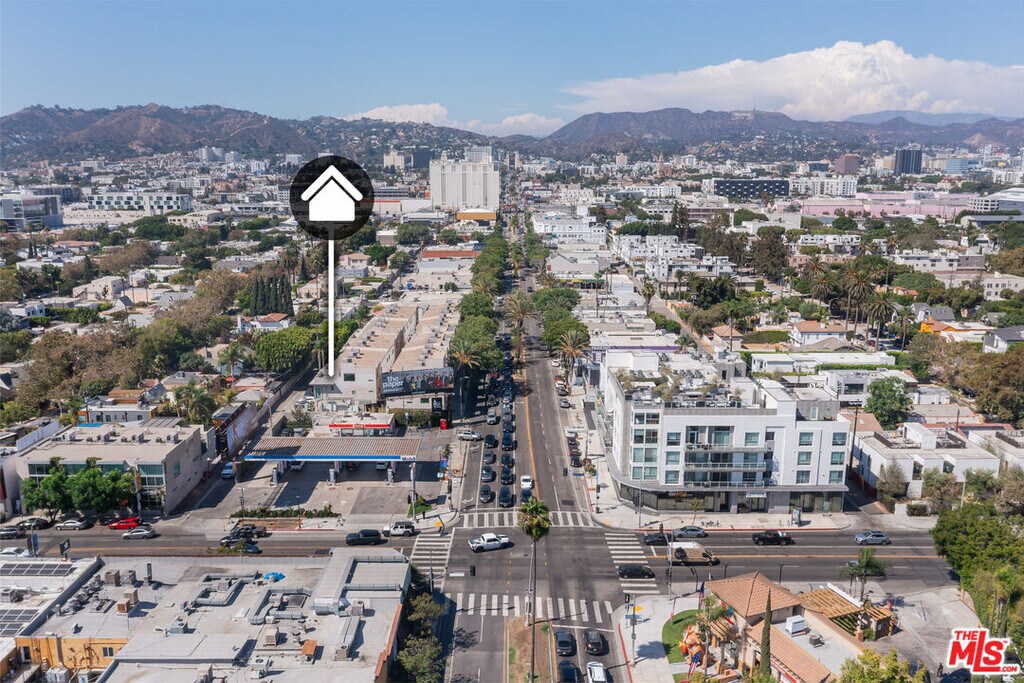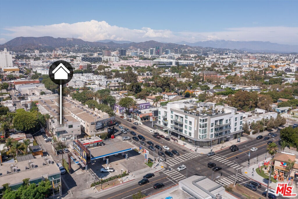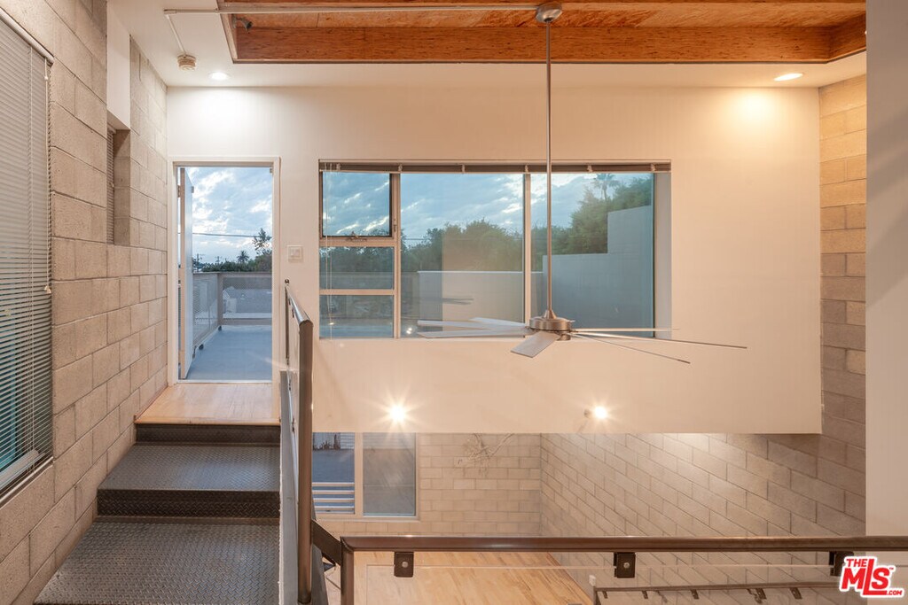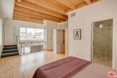Jay Vanos Architects, 2005. True loft for lease in the area along Melrose where the West Hollywood, Hollywood, Beverly-Grove and Hancock Park neighborhoods all meet. This Media District" features great restaurants, shopping and quiet tree-lined streets check-by-jowl with Jeffrey Deitch Gallery, Tartine Bakery and Hollywood production companies (literally across the street from Pizzeria Mozza; Petit Trois; The Cat & Fiddle and more). This quiet, sunny, rear corner unit, one of the largest in the 27-unit condominium, opens through large windows to lush plantings to the west. Enter via a gate on Highland; the rear gate or drive into your private garage. Fully live-work; low-traffic businesses are allowed under the commercial zoning here. The lower level can be partitioned off or entirely used with the garage for a studio/workshop (as it is currently) with its own mini-split for heating and cooling. Soaring ceilings on the main level one flight up, with one grand volume for living, cooking and dining. The flex/guest bedroom or office on this level has its own full bathroom. The top level is the primary suite, open to the level below. A bridge here leads to the spacious roof terrace with sweeping views south, west and north to the Hollywood Hills." MLS# 25611065