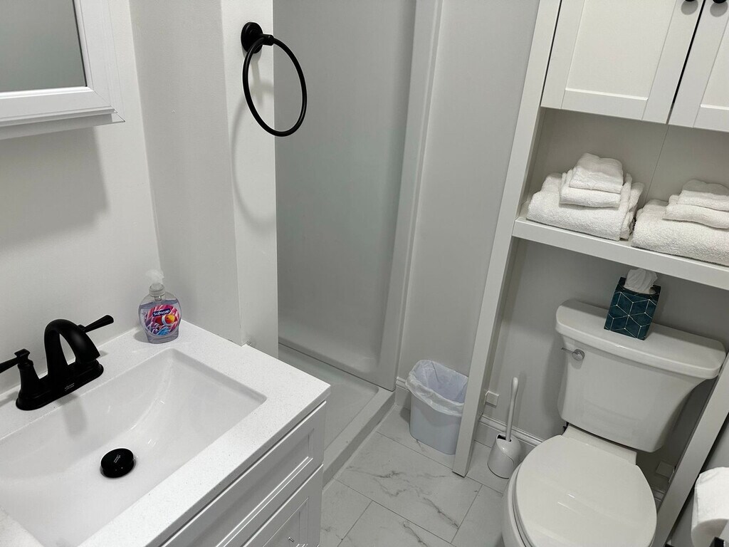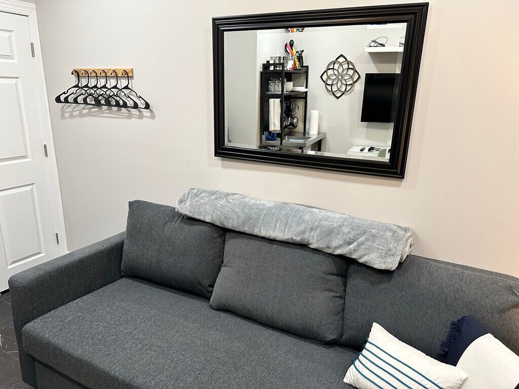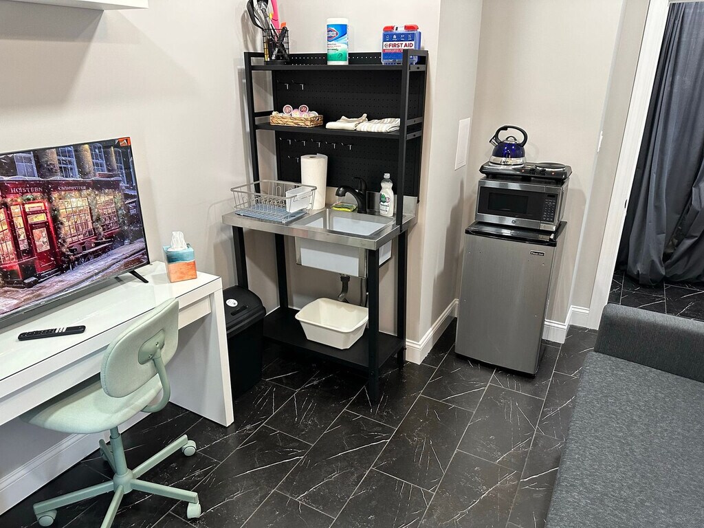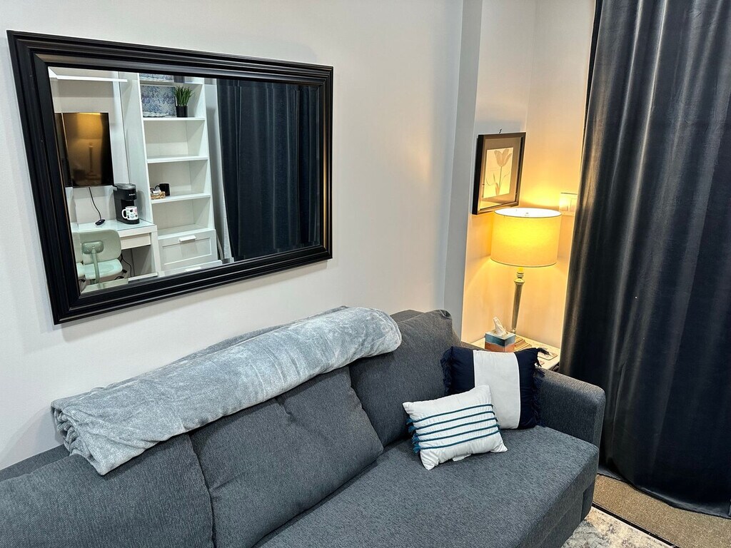 Feel at home in this recently renovated and tastefully decorated studio apartment in Devon, just on the outskirts of Philly on the Main Line. The building was just renovated, so all of the drywall, paint, flooring, furniture, shelves, cabinets, bathroom wall finishes, and plumbing fixtures are new. The room has a new ceiling fan and a 43” TV with ROKU in Guest Mode for you to enjoy free shows as well as log in to your Netflix, Hulu, and Amazon Prime accounts. Parking is available in the parking lot behind the building off of E. Conestoga Road. Devon is home to the popular Devon Horse grounds that have spectacular events in the late spring and fall. Nudy’s Cafe is just a short walk out the back door and up the street to the left. Whole Foods Market is also within walking distance, and if you walk past this market, you’ll come upon a Starbucks. Across the street from the front of the apartment building is a huge shopping center with a Target and a large grocery store also available by foot. The King of Prussia Mall and historic Valley Forge are a short drive away, and Philadelphia is easily accessible by train. Check-out is by 11:00 AM, and a late check-out can be arranged for $30.