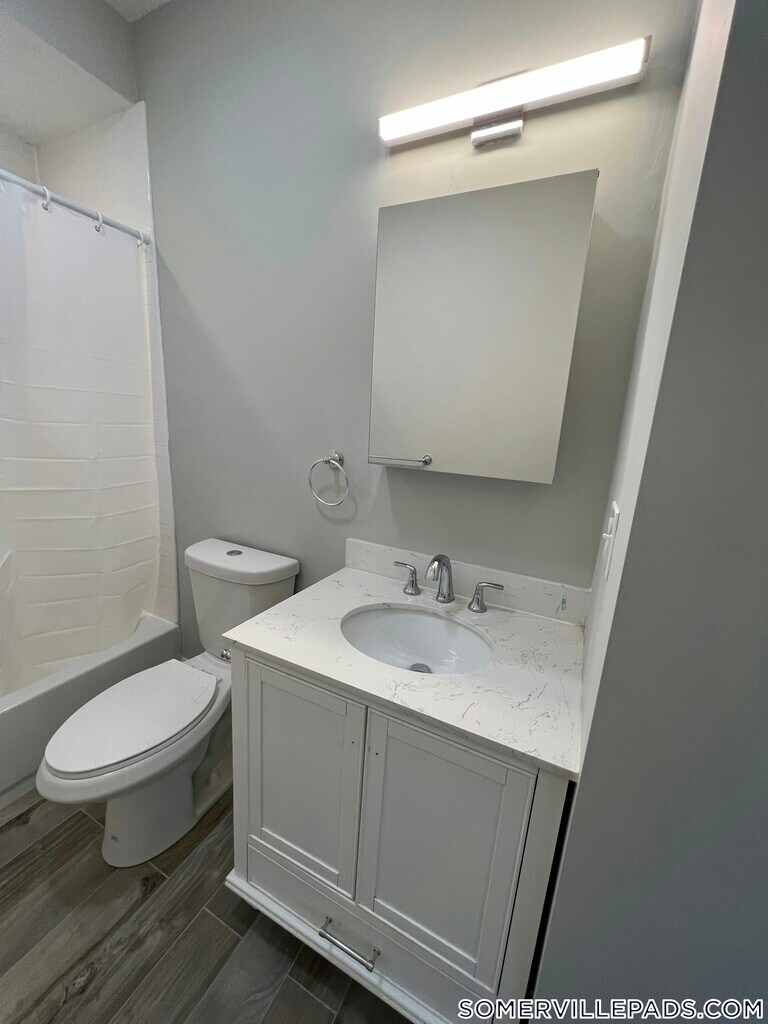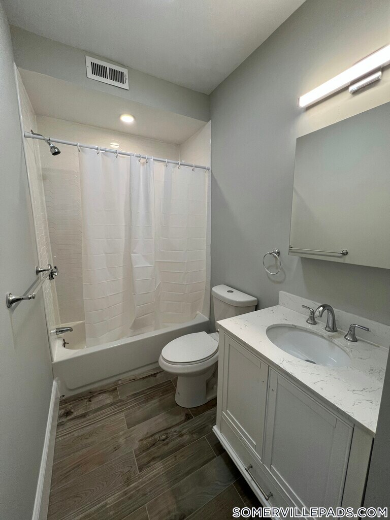 East Somerville/Sullivan Square Closest trains = Sullivan Square (Orange Line) or East Somerville (Green Line) 2 bed/2 bath (second floor, left-side) Modern eat-in-kitchen with new stainless-steel appliances Newly tiled bathrooms Refinished hardwood floors throughout New central heating and AC w/ NEST thermostat Gorgeous white-granite counters In-unit laundry (new washer/dryer machines) Spacious living room Street parking with city permit High ceilings