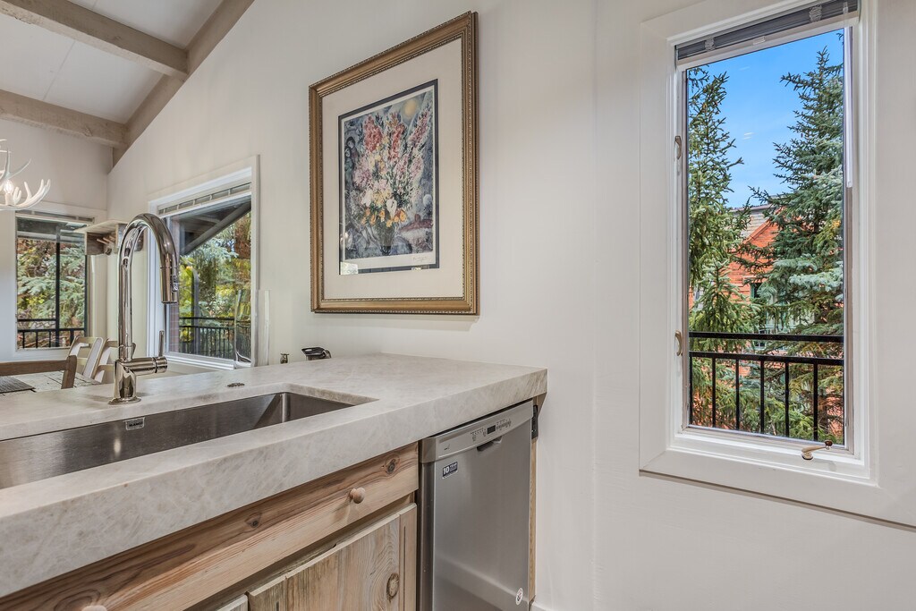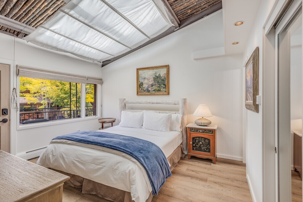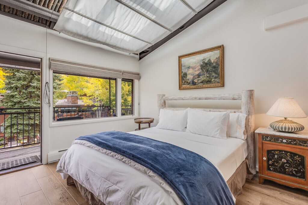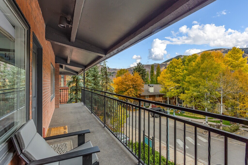 Discover southwestern charm meets alpine convenience in this beautifully updated top-floor corner condo. Tucked into the trees with a secluded, treehouse ambiance, this two-bedroom retreat features vaulted ceilings that create an intimate, cozy enclave. The unit features a generous primary bedroom with an en suite bath and large east-facing windows with mountain views. Both bathrooms have been thoughtfully renovated with modern finishes, while the cozy fireplace adds warmth and ambiance for those après-ski evenings. The coveted corner location ensures enhanced privacy and additional windows for mountain views. Step outside, and you're just moments from the slopes. Walk-to-ski living at its finest. And you are only two blocks from downtown! This is more than a condo; this is your home base for all Aspen adventures, where southwestern style meets world-class skiing, hiking, and biking!