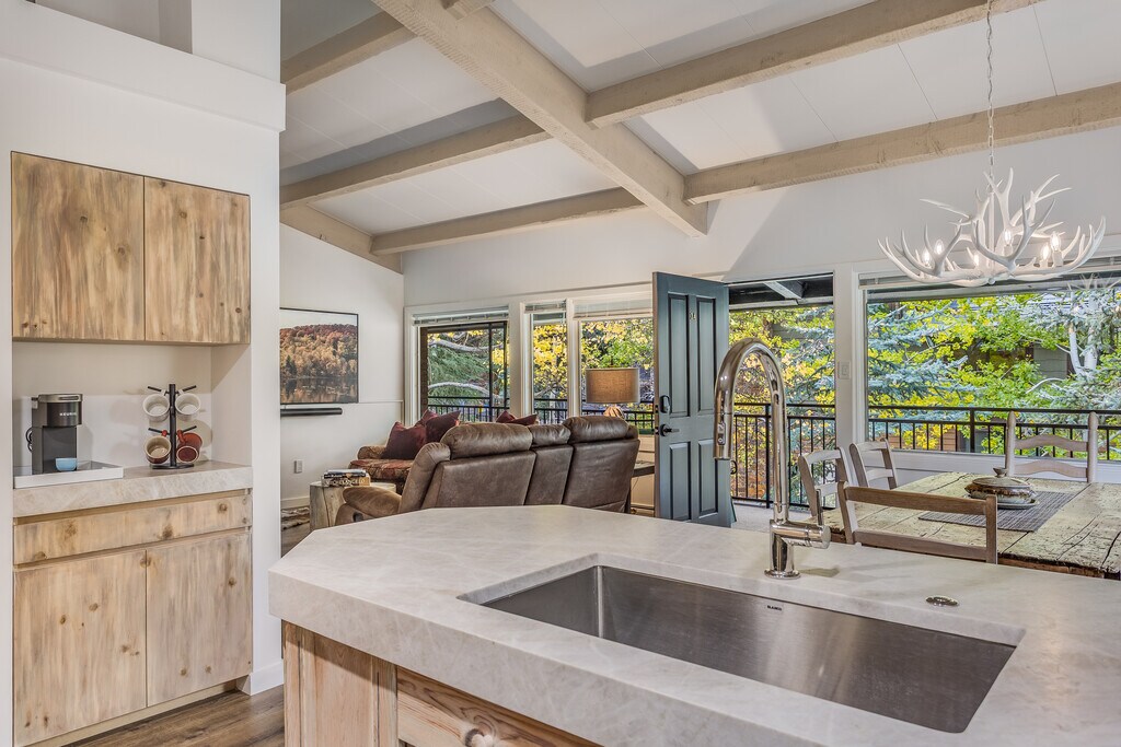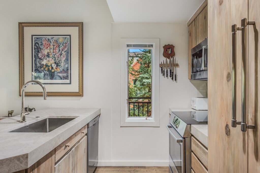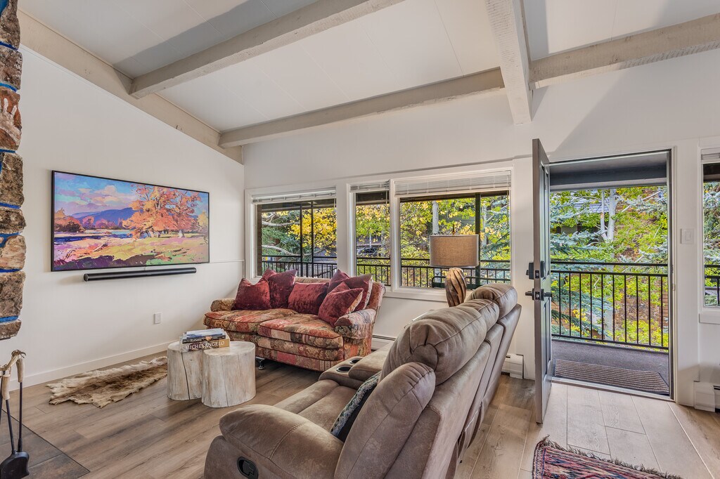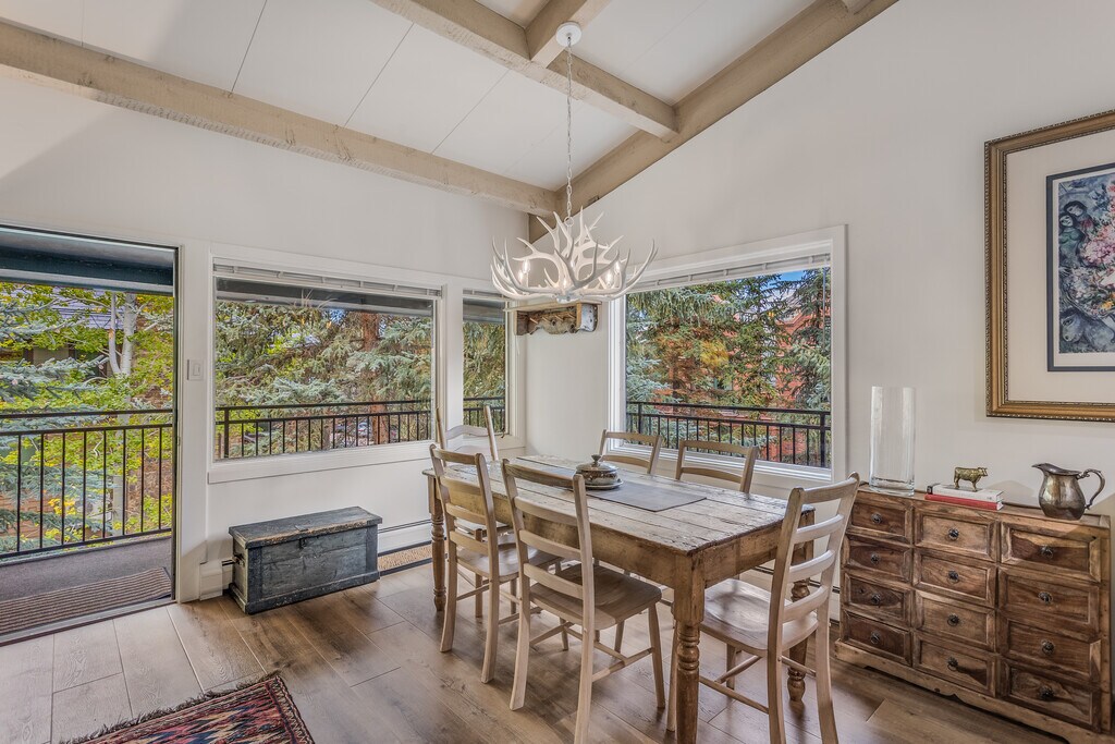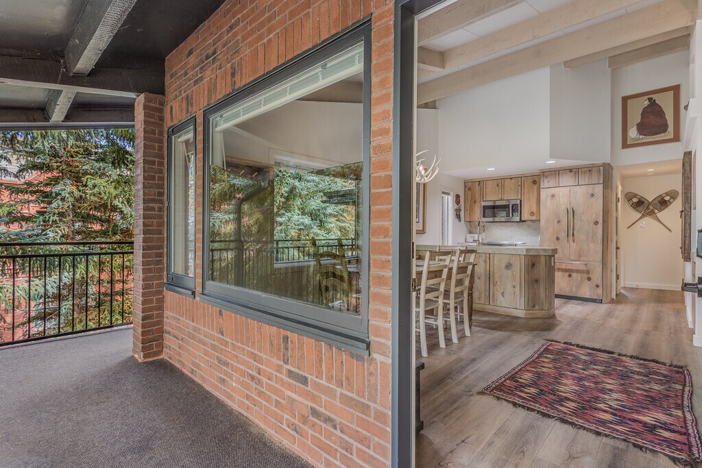 Discover southwestern charm meets alpine convenience in this beautifully updated top-floor corner condo. Tucked into the trees with a secluded, treehouse ambiance, this two-bedroom retreat features vaulted ceilings that create an intimate, cozy enclave. The unit features a generous primary bedroom with an en suite bath and large east-facing windows with mountain views. Both bathrooms have been thoughtfully renovated with modern finishes, while the cozy fireplace adds warmth and ambiance for those après-ski evenings. The coveted corner location ensures enhanced privacy and additional windows for mountain views. Step outside, and you're just moments from the slopes. Walk-to-ski living at its finest. And you are only two blocks from downtown! This is more than a condo; this is your home base for all Aspen adventures, where southwestern style meets world-class skiing, hiking, and biking!