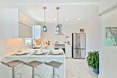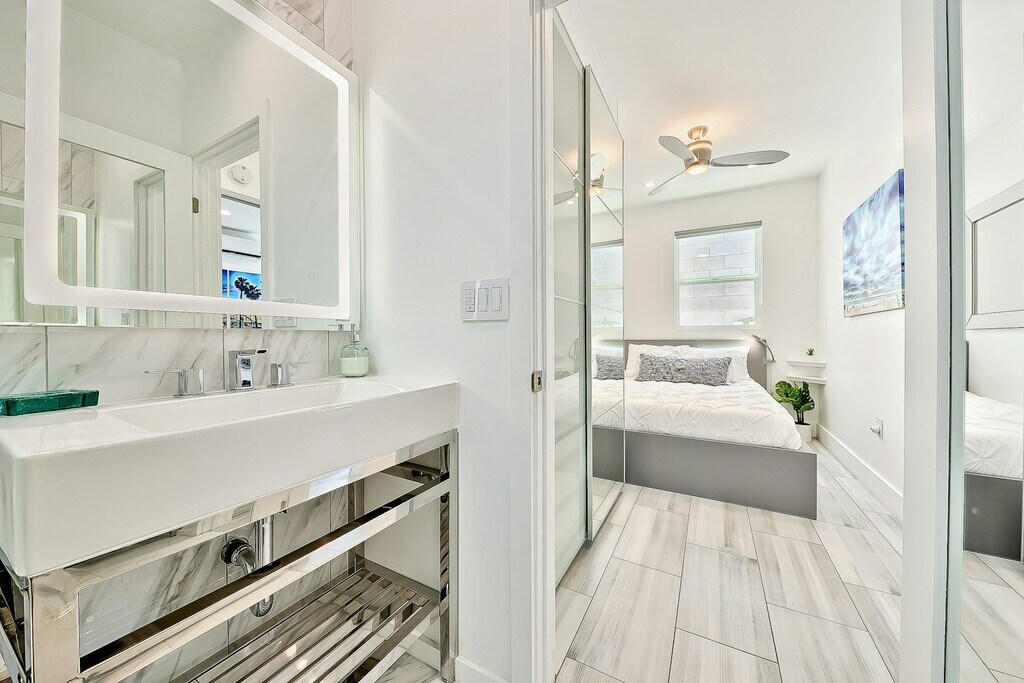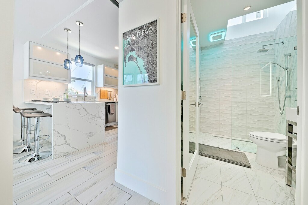 Newly Renovated Beachside Apartment | Prime Mission Beach Location Experience elevated coastal living in this newly renovated 1-bedroom, 1-bath corner condo, perfectly positioned just steps from the ocean and Belmont Park. Located at the quiet rear of the building on the second floor, this approx. 475 sq. ft. residence blends modern luxury with unbeatable walkability. **Bright, Open, and Architecturally Elevated** Soaring 12-foot ceilings and an open-concept layout create an airy, expansive feel rarely found in beachside condos. Brand-new stone flooring runs throughout, offering durability, visual continuity, and a clean coastal aesthetic. **Year-Round Comfort** A mini-split heating and air-conditioning system ensures efficient, quiet comfort in every season whether its cool summers or cozy winters. **Spa-Inspired Bathroom** The bathroom is designed for indulgence, featuring a curb-less tile shower with premium Moen chrome fixtures, a rain showerhead, and a 5-function handheld sprayer. A modern LED color-changing exhaust fan with built-in Bluetooth speaker adds a spa-like, high-tech touch. **Sleek, Fully Equipped Kitchen** The contemporary kitchen is both stylish and functional, outfitted with: -Quartz countertops -Matte white cabinetry -Samsung 4-burner gas smart oven with convection -Microwave -Full-size stainless-steel refrigerator with ice maker and filtered water -18” Bosch dishwasher -Garbage disposal Whether cooking at home or entertaining, the kitchen delivers both performance and polish. **Unmatched Walkability & Lifestyle** Step outside and you’re immersed in the best of Mission Beach: -Restaurants & cafés including Starbucks, Sandbar, Coaster Saloon, DRAFT, Beach House, Cannonball, and beloved local taco shops -Direct access to the historic Plunge pool and the newly opened FIT gym -Ocean, boardwalk, and entertainment just moments away **Additional Details** -Second-floor unit above retail and dining -Smoke-free property -No on-site parking (ample nearby street and public parking available) -No washer/dryer on site (laundromat approx. 1 mile away) **Utilities Included** -Water -WiFi