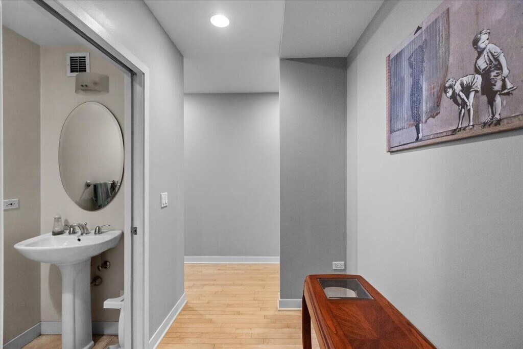 Elevate your lifestyle in this radiant and expansive southeast corner haven, a 2-bed/2-bath masterpiece within the iconic Skybridge building. Marvel at breathtaking panoramas of the Chicago skyline, setting the stage for a living experience where every element of comfort is effortlessly curated within the premises or just steps away. Indulge in the luxury of a thoughtfully designed split floor plan, ensuring privacy for the dedicated primary suite, strategically distanced from the common areas and the second bedroom. The primary bedroom, generously proportioned, accommodates not only rest but also a space for a cozy home office. A walk-in closet, meticulously crafted with custom shelving, complements the lavish primary bathroom featuring a separate shower and a sumptuous soaking tub. Step into the communal space with an open layout that seamlessly integrates a kitchen adorned with 42" cabinets, pristine Calacatta Roma countertops, and a stylish bar with room for four barstools. The combined dining room and living room boast new hardwood floors and a contemporary light fixture, creating a perfect harmony of form and function. The second bedroom, offering expansive southern views, is generously sized and comes with large professionally organized closets. Convenience meets luxury with in-unit laundry, ensuring your daily routines are seamlessly integrated. This full-amenity building is a testament to a lifestyle of opulence, offering a 24/7 door person, on-site dry cleaner, a well-lit and top-tier fitness center, a rooftop terrace with panoramic vistas, a dog run, and a secure bike room. Your belongings find a home in the included storage locker, completing the package of a truly elevated living experience.