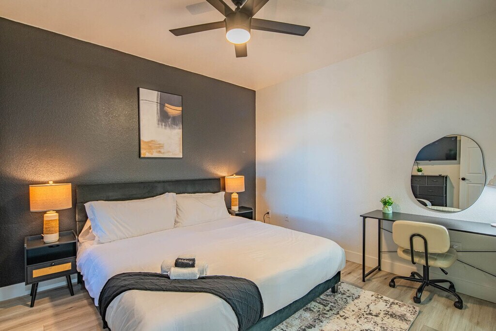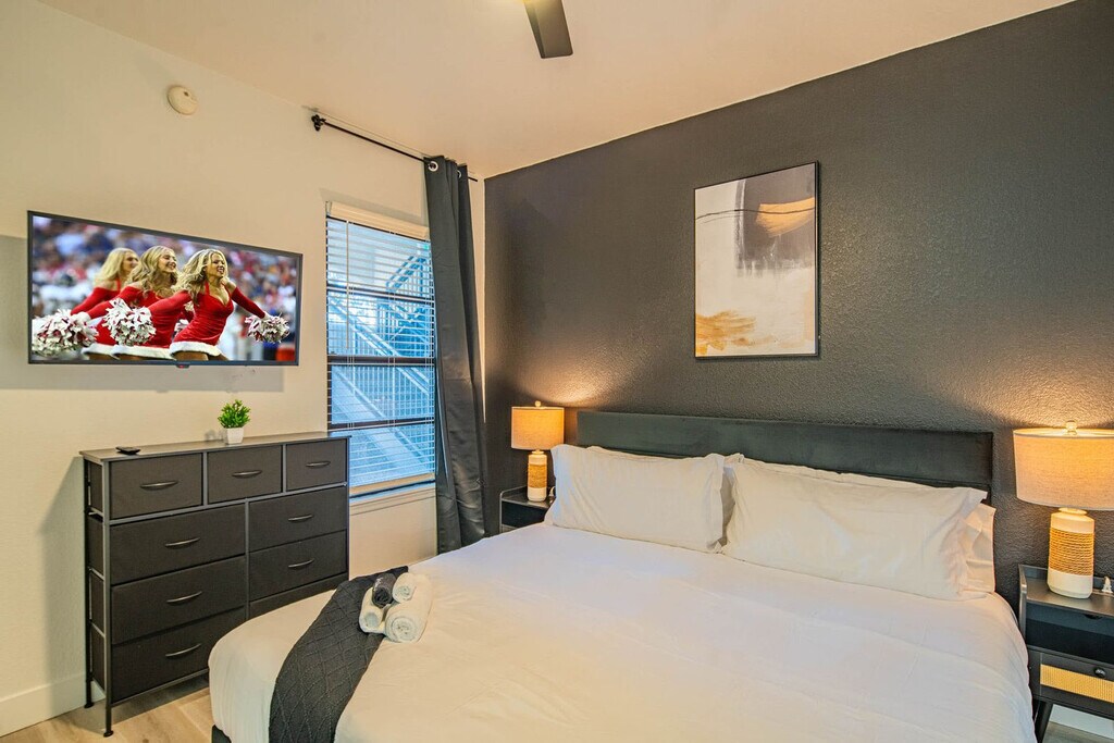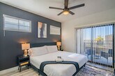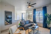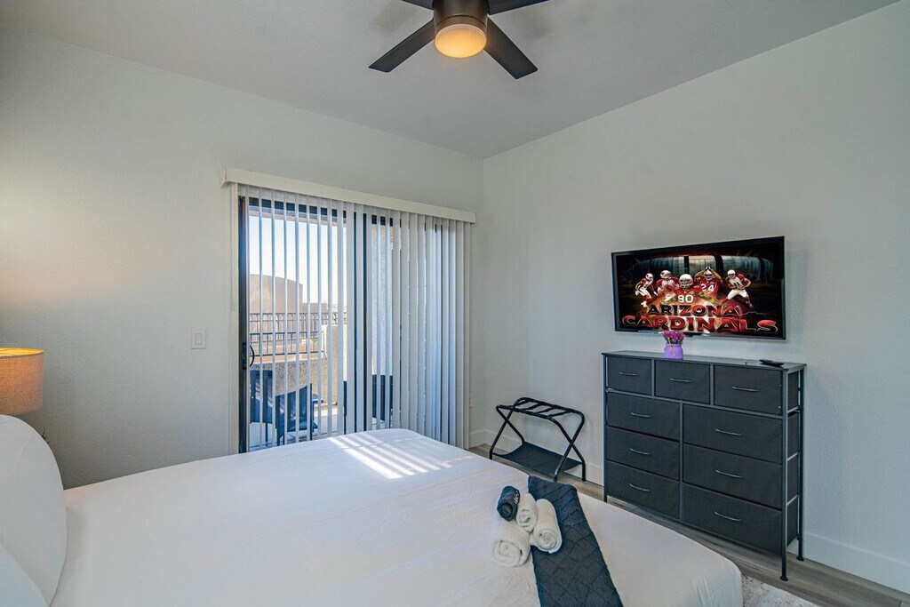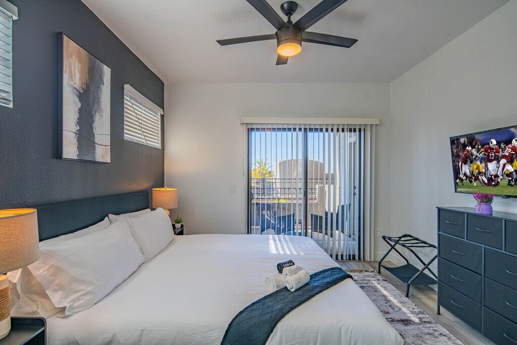 Unwind in this modern and stylish apartment in Glendale, located on the 3rd floor of a vibrant area. You're just minutes away from top attractions like State Farm Stadium and the Westgate Entertainment District, making it easy to explore the best of Glendale whether you're here for business or leisure. Relax in this 2-bedroom, 2-bathroom unit designed with a socially and environmentally conscious living environment in mind. The innovative open-concept design blends the living and dining areas with the fully equipped kitchen, creating a modern and sleek living experience. The living room is ideal for relaxing and enjoying the company of friends and family, featuring a sofa bed, a 4K 55" HDR Smart TV, and a coffee table. The kitchen is equipped with a microwave, stove, oven, refrigerator/freezer, dishwasher, coffee maker, electric kettle, and all necessary utensils, along with a dining table and chairs. The bedroom offers a king-size bed, office desk, and reading lamps, while the bathroom is stocked with essential toiletries. Parking is available on the premises, with instructions provided at check-in. Pets are allowed depending on size or if they are service animals, with an additional cleaning fee required per pet: $25 per night for 1-7 nights, $200 for 8-29 nights, and $300 for 30+ nights. There is a 2-pet maximum, and only cats and dogs are allowed. Breed restrictions apply, and a $500 fee will be charged if pets are brought without prior notification. Located in a prime area of Glendale, this apartment offers easy access to top attractions such as State Farm Stadium and the Westgate Entertainment District. The vibrant neighborhood ensures that you're never far from the action, making it an ideal spot for both business and leisure travelers. This property does not have an elevator, so guests need to walk upstairs to reach the unit on the 3rd floor. Noise monitors are installed to measure noise levels, and tampering with them will incur a fee. Security cameras are present in the hallways for safety. Guest verification is required, including providing a government-issued ID and matching credit card prior to check-in. A rental usage agreement must be signed, and check-in instructions may be withheld until verification is complete. Repeated violations may involve local law enforcement, with associated expenses being the responsibility of the guest. [SI]