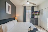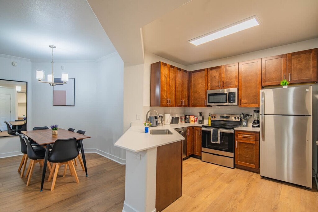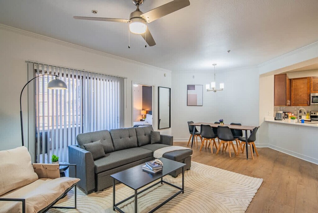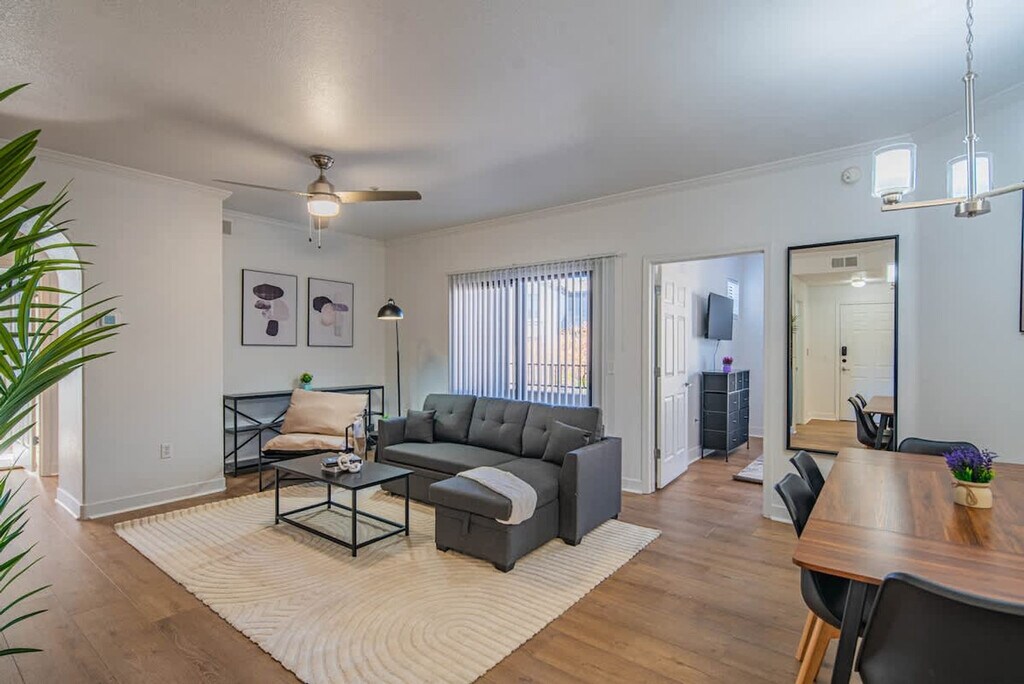 Unwind in this modern and stylish apartment in Glendale, located on the 2nd floor of a vibrant area. You're just minutes away from top attractions like State Farm Stadium and the Westgate Entertainment District, making it easy to explore the best of Glendale whether you're here for business or leisure. Relax in this 3-bedroom, 2-bathroom unit featuring an innovative open-concept design that blends the living and dining areas with the kitchen. The living room is ideal for enjoying the company of friends and family with a sofa bed, a 4K 55" HDR Smart TV, and a coffee table. The fully equipped kitchen includes a microwave, stove, oven, refrigerator/freezer, dishwasher, coffee maker, and dining table with chairs. The bedroom offers a king-size bed with linens and an office desk and chair. Parking is available on the premises with instructions provided at check-in. Pets are allowed depending on size or if they are service animals, with an additional cleaning fee required per pet: $25 per night for 1-7 nights, $200 for 8-29 nights, and $300 for 30+ nights. There is a 2-pet maximum and only cats and dogs are allowed. Unauthorized pets will incur a $500 fee. Located in a prime area of Glendale, this apartment offers easy access to top attractions like State Farm Stadium and the Westgate Entertainment District. Enjoy the vibrant neighborhood and explore the best of Glendale with ease. There are no elevators at this property, so guests need to walk upstairs to the 2nd floor. Quiet hours are between 10pm and 8am every day. Violations of this rule may result in cancellation of booking and removal from the property without refund. There is a strict no-party policy, and any signs of smoking will result in a $500 fine. Unauthorized guests will incur a $100 fine per guest. Early check-in/check-out may be accommodated at a fee of $25 per hour, subject to availability. Lost or unreturned keys will incur a fee of $80 for key replacements and $150 for key fob replacements. Noise monitors are installed to measure noise levels, and tampering with them will result in a fee. Includes an office desk and chair in the bedroom for a comfortable work-from-home experience. [SI]