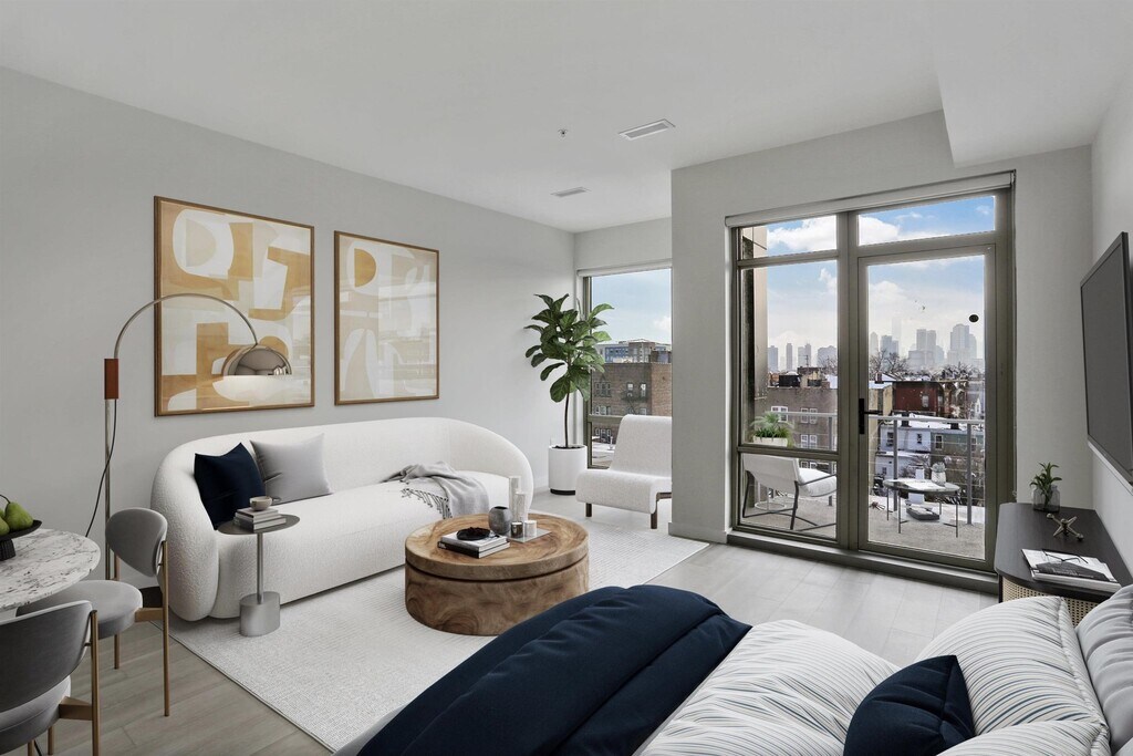 Very spacious Studio + Alcove offering NYC views, a private balcony, and abundant storage throughout. Enjoy a sleek chef’s kitchen with a gas stove, perfect for cooking and entertaining. Additional conveniences include in-unit laundry and on-site parking available for $200/month (subject to availability). *Photo's are representative of the unit.* The advertised rent is the net effective. The gross monthly rent is $2,240 with one month free on a 13+ month lease. Welcome home to 75 Jordan Avenue! Located in the vibrant Jersey City Neighborhood, 75 Jordan is a recently developed residential building and curated collection of 35 thoughtfully designed studio, one and two- bedroom residences. Featuring a virtual doorman, brand new fitness center, beautifully landscaped rooftop space, and rooftop lounge with breathtaking views of Manhattan, 75 Jordan is the definition of an elevated home lifestyle. A renter’s paradise at 75 Jordan features sophisticated elements and modern accents. Brand new and wisely designed, most residences offer private terraces extending your home living space outdoors. Dive into Serenity. Kitchens boast beautiful Caesarstone countertops, white and gray textured cabinets with polished chrome fixtures and brand-new stainless-steel appliances, perfect for kitchen prep, storage, and hosting gatherings. Offering a sanctuary escape, bathrooms feature new Caesarstone vanity tops with polished chrome accessories and fixtures as well as porcelain flooring and a taupe porcelain accent wall. Located in the heart of Jersey City, 75 Jordan is within proximity to many recommended restaurants, bars, nightlife and destination spots. Enjoy the beautiful nature of Lincoln Park or outdoor activities such as golfing at Skyway Golf Course just moments away. In addition, the Journal Square Path station is nearby, connecting you to multiple transportation hubs throughout Jersey City, Hoboken, and New York. Make your way towards the river to find two ferry stations ready to escort you around Manhattan. This central location offers the luxury of convenience while enjoying all the neighborhood has to offer. Copyright Hudson County MLS. All rights reserved. Information is deemed reliable but not guaranteed.