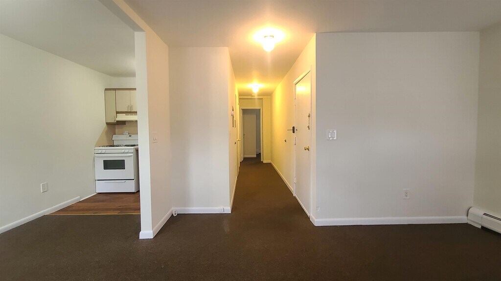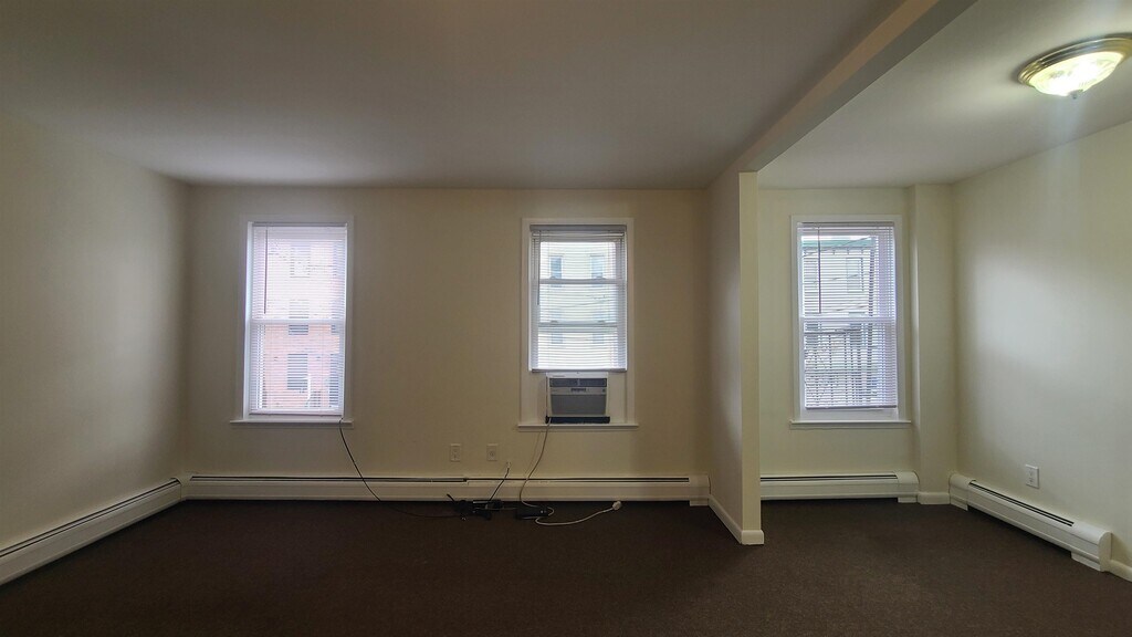 Three-bedroom, one-bath apartment available for rent features carpeting throughout and window units for air conditioning. Free street parking is available, and pets are considered. The unit can be moved into as soon as possible.