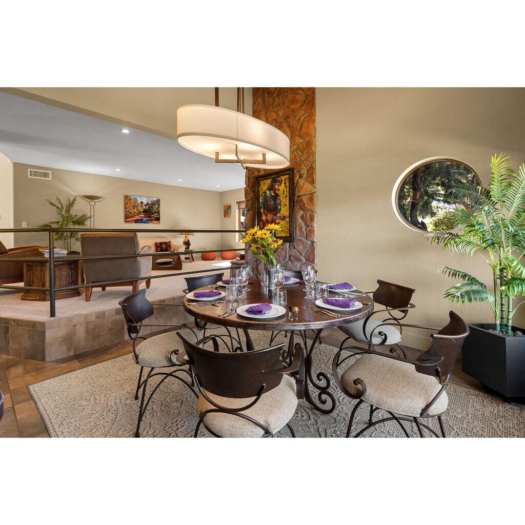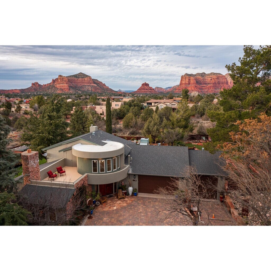 Feel at home in this private Sedona retreat, set on a full acre with manicured desert landscaping and unobstructed red rock views. Located in the Village of Oak Creek, this home features 5 bedrooms and 3.5 bathrooms and sleeps 10. This home is designed for relaxation and adventure, featuring a spacious cook’s kitchen with large and small appliances and a breakfast bar with 4 stools. There are two inviting living areas: a cozy den and a main living room with a 65” internet-ready TV with Dish Satellite and streaming apps. Enjoy the private saltwater cold plunge pool (not heated) with an outdoor shower, a six-person hot tub, an outdoor firepit, a gas BBQ, a Traeger smoker, a wood-fire grill, a zen garden by the lily pond, and an outdoor dining area with a mini fridge and multiple lounge/sitting areas across the acre. Also included is high-speed private Wi-Fi throughout. Two-car garage and a large driveway are available for extra parking. Located in the Village of Oak Creek, this home offers easy access to Sedona’s best hiking, dining, and galleries without the crowds of Uptown, and is just minutes from Bell Rock, Cathedral Rock, and a 10-minute drive to Uptown Sedona. It is ideal for family reunions, couples’ getaways, or group retreats. [SI]
