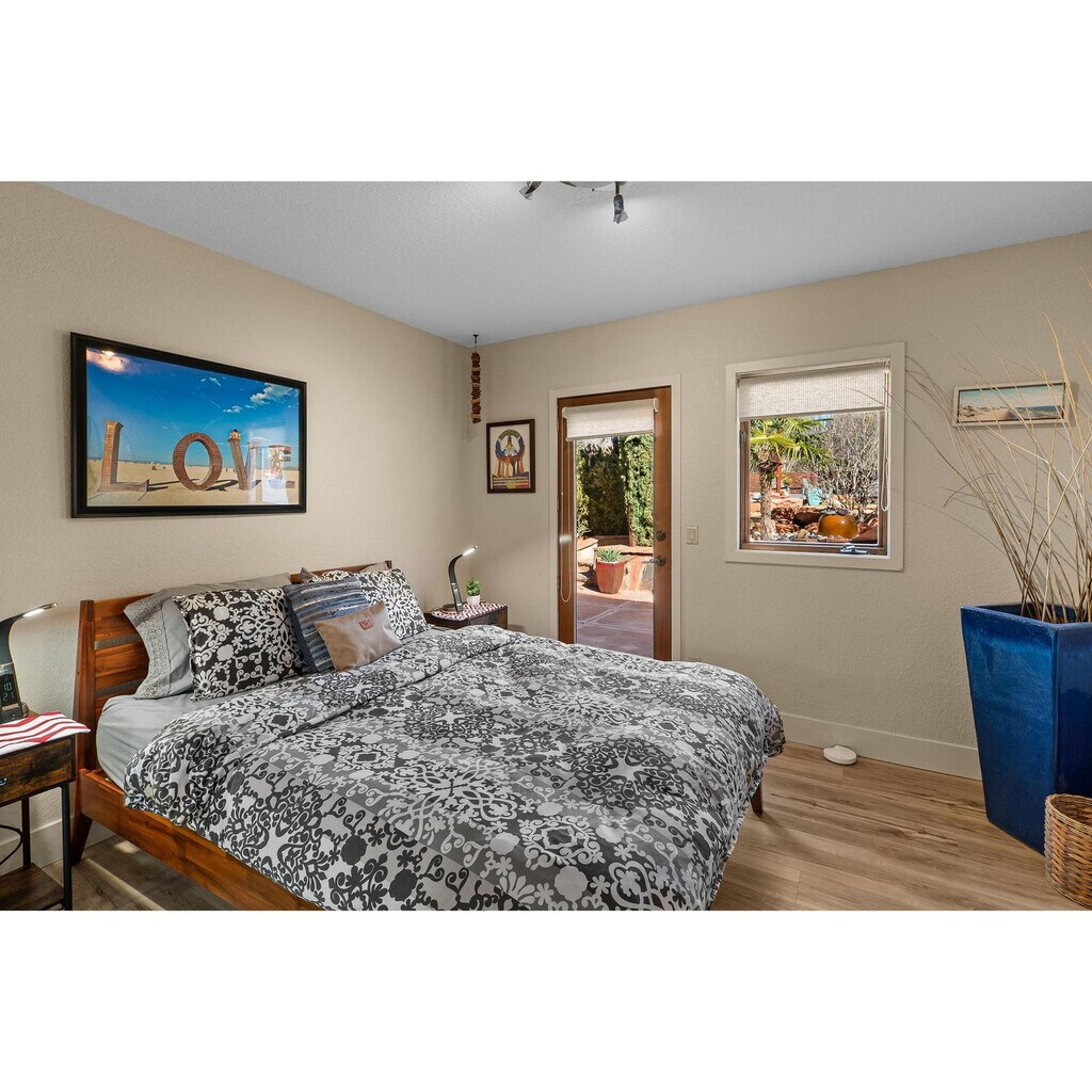 Feel at home in this comfortable 1-bedroom suite located in the Village of Oak Creek, Sedona, perfect for singles or couples. This suite features a queen-size bed, a nicely equipped kitchenette, a private bathroom with a shower, and air conditioning. Guests also have access to a landscaped private oasis with a shared hot tub, cold plunge pool, and numerous lounge and seating areas. For your entertainment needs, there is a 55-inch flat-panel TV with Apple TV. Guests can enjoy the amenities of the 1-bedroom suite, accessible via the garage, including the laundry room, hot tub, plunge pool, backyard lounge areas, and parking for up to two cars. Access to the outdoor cooking area, barbecue, smoker, fire pit, and outdoor dining area is restricted for guests staying at the Red Canyon Retreat. Ideally located in the Village of Oak Creek, the suite is right at the doorstep of Wild Horse Mesa (great hike) and minutes away from two golf courses. Trailheads for Bell Rock and Slim Shady, offering a network of walking, hiking, and biking trails, are also nearby. Uptown Sedona is just 6 miles away. Explore the lively community of the Village of Oak Creek, with its great restaurants, coffee spots, and bike shops, serving as the southern gateway to Sedona and putting you close to top trails like Hi Line, Templeton, Llama, Bell Rock Pathway, and Rabbit Ear. A 5% credit card processing fee will be charged if you pay by credit card. [SI]