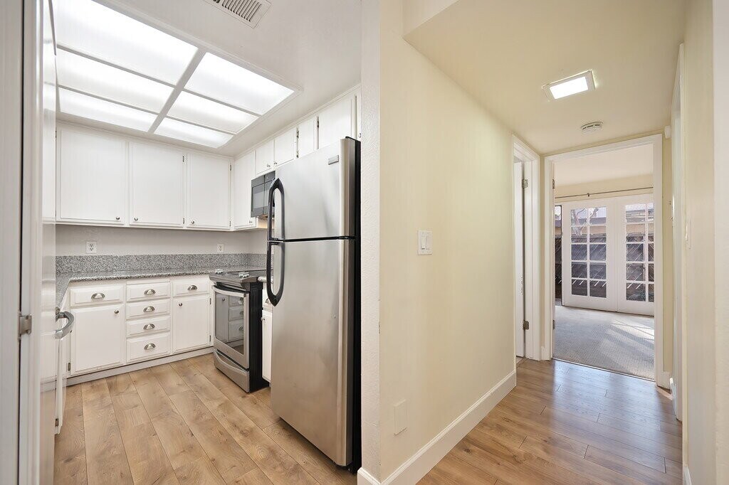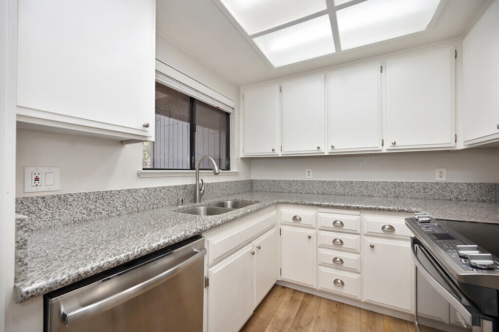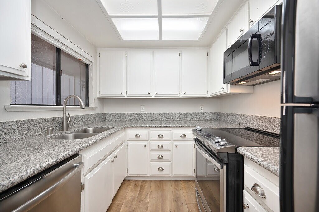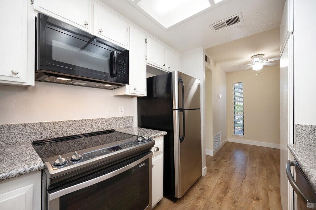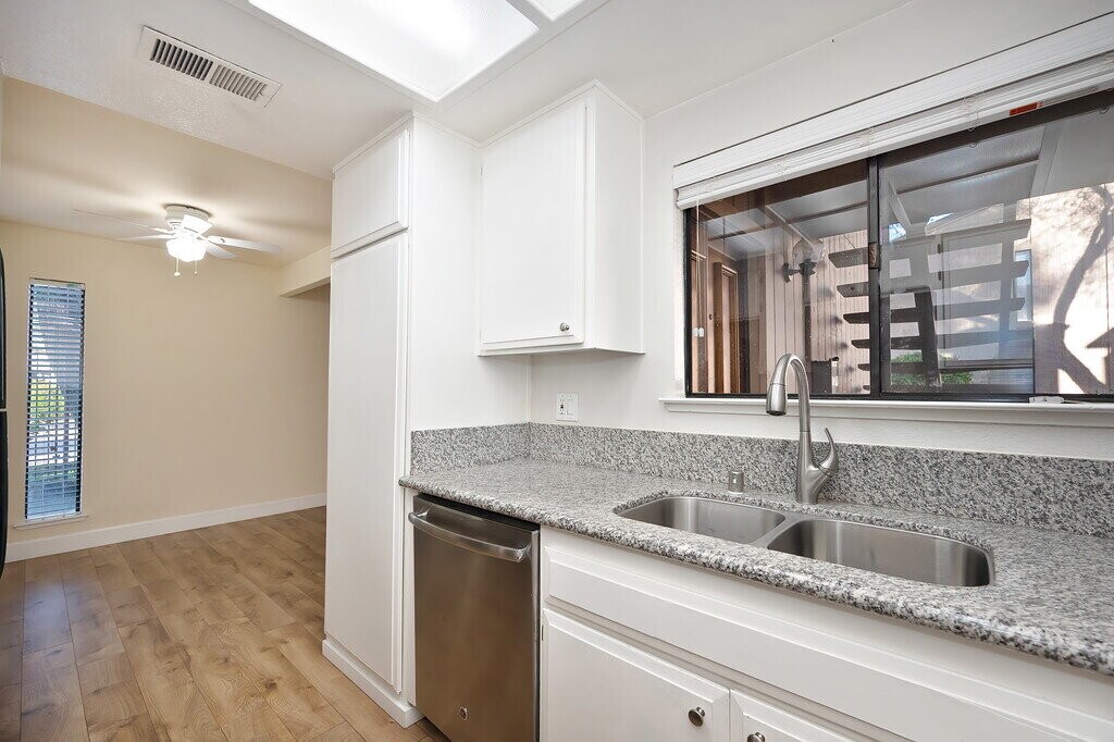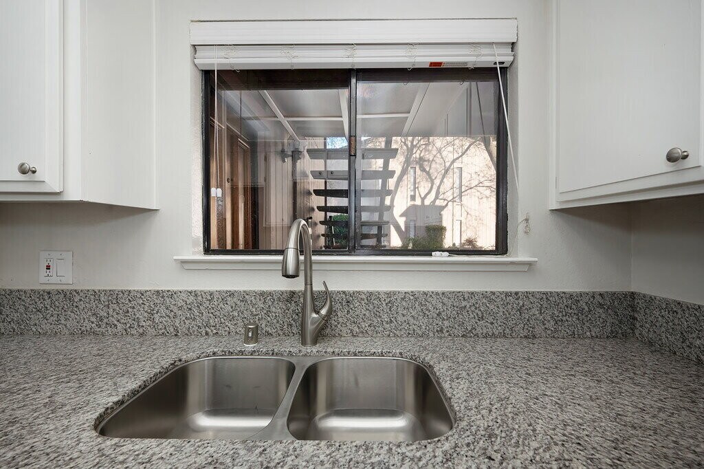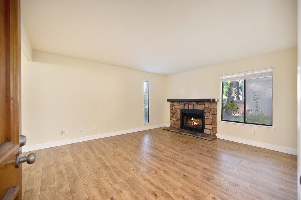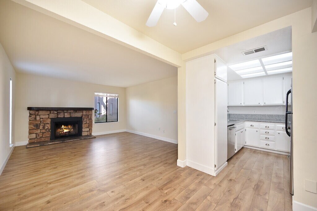 Cozy single story, 1st floor 1 bed and bath condo, close to everything you need. Kitchen includes granite counters, window over sink, light/bright cabinets, stainless dishwasher, fridge, stove all included. Easy to care laminate wood-like flooring. Bath includes tile surrounds and floor, large tub, plenty of linen storage. Enjoy the newer washer/dryer too. Romantic fireplace to snuggle near or stroll through the nature paths. 2 Swimming pools and jacuzzi. Close to Trader Joe's and other desirable shops and a 8 minute ride to the American River Bike Trials and the Old Fair Oaks Village. Bottom level entry, single condo. Trash and water/sewer are included in rent. New Central Heat and Air. I included some virtual staging photos. 1 carport parking space and open parking as well. Gated Community. Move in ready today! No Pets