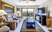 This luxurious top-floor corner unit 2 bed 2 bath split floor plan offers modern upgrades and lots of privacy. All within this beautifully furnished, move-in-ready condo. Relax on your private balcony and enjoy amazing sunrises with stunning mountain and city views. Queens Bay Resort offers free covered vehicle parking, along with boat/trailer and RV parking, all secured and gated, a grand lobby for entertaining , and a sparkling heated pool with 2 spas. This resort is just steps to restaurants, movies, channel, park, and night life! Elevators and pet-friendly! Perfect for a traveling professional.