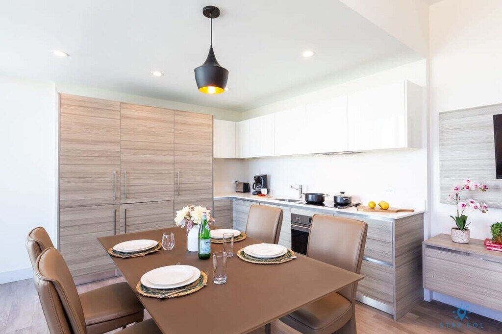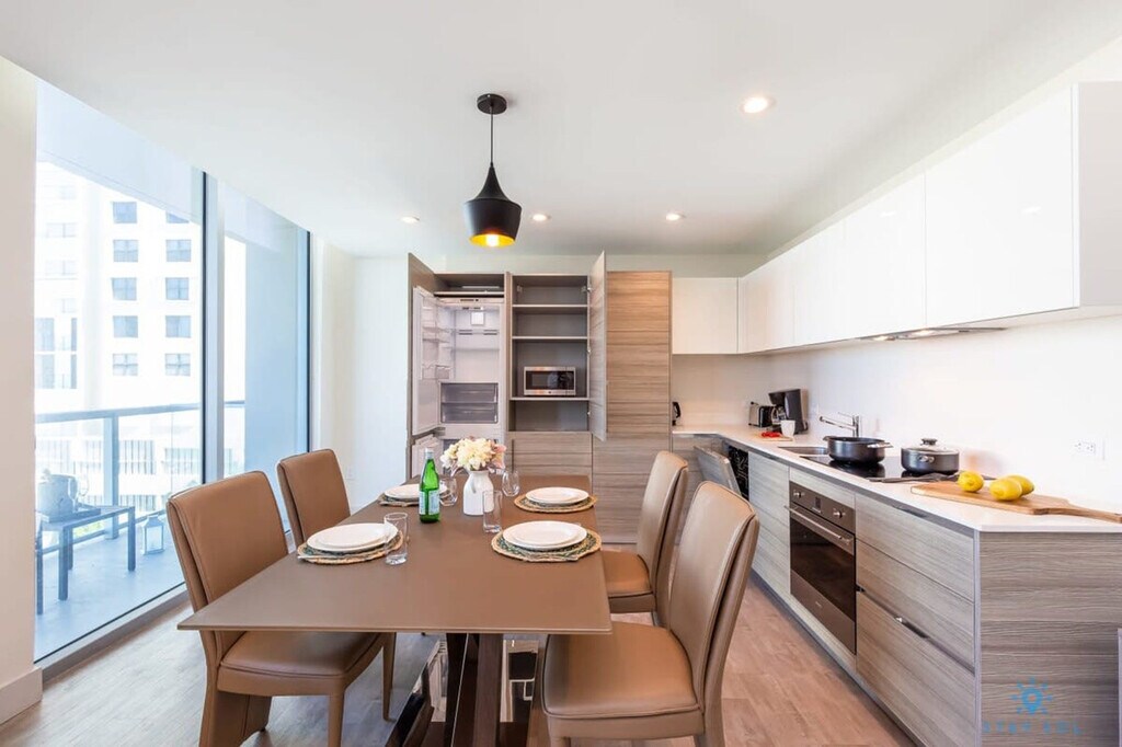 Feel at home in this modern condo resort, steps from the legendary Hollywood Beach Broadwalk. Overlooking a beautiful beach surrounded by bars, live music events, and wonderful restaurants, this apartment offers a luxurious stay for up to 4 guests. This brand-new apartment offers all the comfort you need. The well-designed bedroom mixes natural wood and stone with organic textures, along with state-of-the-art technology. The fully equipped gourmet kitchen offers a stainless steel refrigerator/freezer, a glass stove, an integrated oven, a silent dishwasher, an integrated microwave, a stove, dishes, a coffee maker, and a toaster. The spacious bedroom includes a hairdryer, an electronic safe, an iron/ironing board, and TVs. Enjoy access to the rooftop infinity pool, hot tub, gym, and sun deck. The apartment is fully furnished with ceramic floors, electronic door locks, European-style cabinetry, and modern-style designer fixtures and faucets. Parking is available at the condo for $42 a day, or you can issue a public parking pass for the whole month for $110 plus taxes, which allows you to park on any street or city parking lot (300 Connecticut St). A pack-n-play crib is available upon request. One pet per unit is welcome for free; fees may apply for additional pets. The condo has a 25 lbs restriction (doesn’t apply to esa). Located along North Ocean Drive in the lively community of Hollywood Beach, this apartment puts you at the heart of the action. Within walking distance of the famous Hollywood Beach Broadwalk and the beach, you can enjoy exciting activities such as jet skiing, fishing, sailing, and biking. South Beach and Miami are a short drive away. The Broadwalk, paved with bricks, has 2.5 miles of bars, restaurants, boutiques, and shops. Swimming is at your own risk; there is no lifeguard on duty. Children must be supervised by a responsible adult at all times. Please keep all doors closed and the air conditioning on at all times to help prevent condensation and property damage. Check-in is any time after 4 pm, and check-out is any time before 11 am. A registration fee of $50 (one time only) applies. The public beach and Broadwalk within the City of Hollywood Beach does not allow pets (service animals are still welcome!). [SI]