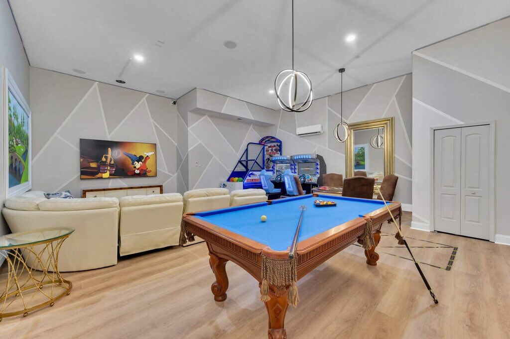 Dreaming of the ideal getaway? Look no further! This luxury villa provides everything you need for a memorable vacation, from top-notch amenities to access to the Reunion CDD amenities. The beautiful outdoor area is the perfect place to wind down after exploring the parks and start your evenings in style. Located in Reunion Resort, this villa features 5 spacious themed bedrooms and 5.5 bathrooms, offering ample space for relaxation. Thoughtfully designed with a large living area, this villa includes a game room with a pool table, arcade, and games, as well as a large full kitchen with stainless steel appliances. Enjoy spacious indoor and outdoor dining areas, a private pool with the option to add heat, and outdoor pool loungers for ultimate comfort. If you would like to add pool and spa heating to your reservation, the cost for this amenity is $35 per day of stay, which will be invoiced separately. We kindly ask for at least a week's notice. We do welcome furry friends with a written notification and approval. A pet fee is applied and subject to up to $150 security deposit. Parking can accommodate up to 2 vehicles in the driveway parked side by side. Reunion Resort is a fun-filled luxury gated community that will make you feel like enjoying a stroll around one of the many golf courses. Many people are full-time residents, so please drive the 25 MPH speed limit at all times and watch for golf carts. While Reunion has many wonderful restaurants to enjoy, out the back gate, you will find every type of food you can imagine, alligator farms, airboat rides, and a flurry of water parks and places of enjoyment. Universal is 20 miles away, SeaWorld is 15 miles away, and Magic Kingdom is just 8 miles away. Self check-in and check-out are available for your convenience. Check-out time is 10 AM, and late check-outs may incur a fee of up to $300. The home is professionally cleaned and sanitized between each guest. There is absolutely no smoking and no drugs allowed inside the home or elsewhere on the property. Quiet hours are between 10 PM and 8 AM. Please respect the neighborhood and neighbors by keeping excessive noise to a minimum during this time. We can accommodate a maximum of 13 guests at any given time. The individual making the reservation must be at least 21 years of age and must be one of the guests staying at the property. No third-party bookings are allowed, unless otherwise agreed upon in written form. Only the number of guests indicated on the reservation are allowed to stay overnight on-premise, unless otherwise agreed upon in written form. Please take out the trash and dispose of it properly per instructions upon departure. Report damages immediately. We reserve the right to terminate a reservation without refund, and/or pursue monetary fines if guests are found to be in violation of any of these rules. This villa offers a remote work-friendly environment with free Wi-Fi, making it easy to stay connected during your stay. [SI]