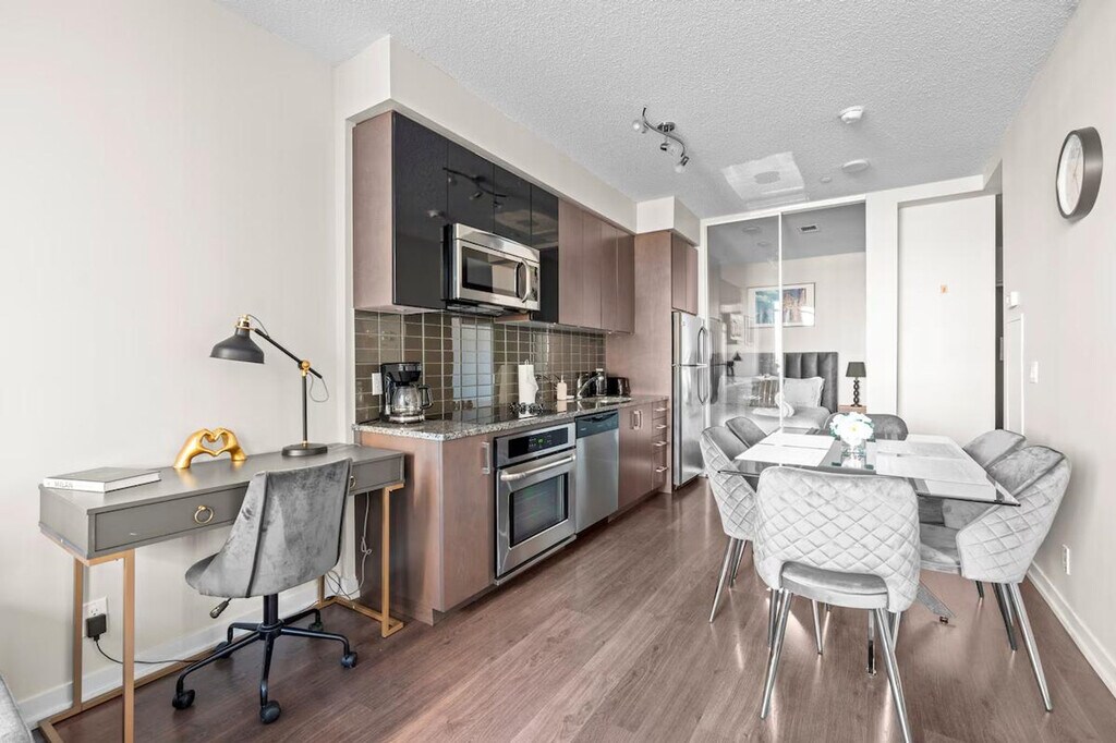 Feel right at home in this open-concept gem located at Yonge & Eglinton, just steps from the subway. This comfortable suite has everything you need. The fully functional kitchen is equipped with tea, coffee, a kettle, coffeemaker, and toaster. A washer and dryer are available with supplies. There are 2 bathrooms with towels, shampoo, conditioner, body wash, a hair dryer, and other toiletries. Paid underground parking with in/out privileges is available upon request for $25 per night and it's recommended to request it in advance as vacant parking spots may be limited. Pets are allowed in the apartment for a fee of $10 per night for 1 pet, please confirm the opportunity prior to booking. A travel crib (for 0-18 month baby) and bed rails are available for $5 per item per night, please book these items in advance. Guests have access to the indoor swimming pool, sauna, hot tub, steam room, and gym in the building. Direct access to Loblaws is available in the building. Surrounded by restaurants, movies, and shopping, this apartment is centrally located. According to the condo rules, we must provide information about our guests to the condo management prior to their arrival, including every guest's name and their ID details, vehicle and license plate numbers (if you require a parking spot). Guests whose names or ID do not match the information given are not allowed into the building. You need to be 18 or over in order to check in. We kindly ask you to send us your selfie with your ID in your hands as an anti-fraud measure. [SI]
