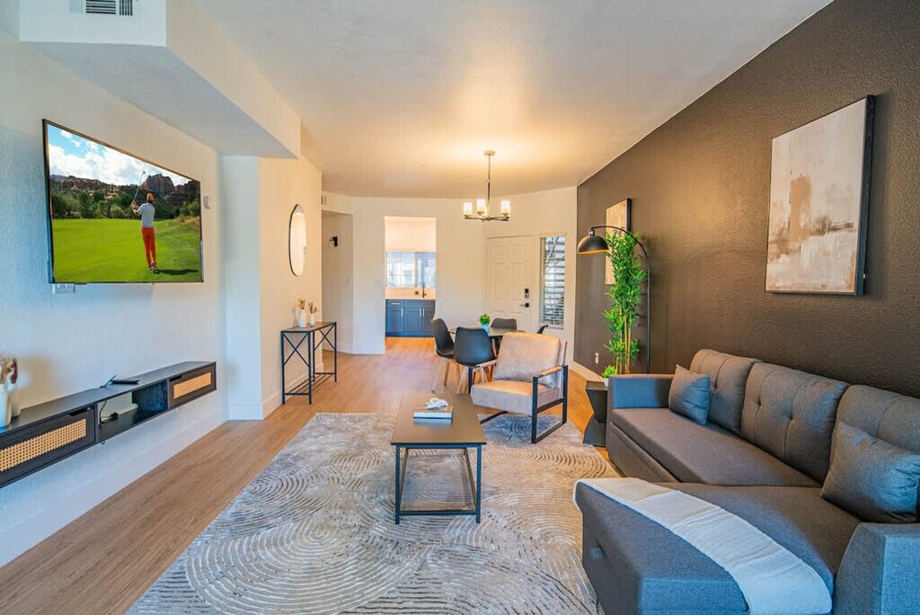 The advertised rate of $4,053/month is the lowest available price, based on a 1 month(s) stay with a move-in date of June 29, 2026. Rates vary depending on the duration of stay, season, and other parameters. For exact pricing and additional pricing components, please visit our website and enter your desired move-in and move-out dates. The rate is applicable when billed upfront; it can be higher if billed in multiple payments. Feel at home in this stunning 2-bedroom, 2-bathroom apartment in Scottsdale. Nestled on E Princess Dr, you're moments from top-rated golf courses, fine dining, upscale shopping, and vibrant nightlife. This luxurious retreat features a modern open-concept design, blending the kitchen, dining, and living spaces. The living room includes a plush sofa bed and armchair and a 58" 4K HDR smart TV. The spacious, fully equipped kitchen has a microwave, stove and oven, refrigerator/freezer, dishwasher, toaster, coffee maker and coffee essentials, electric kettle, blender, air fryer, a full set of glasses, silverware, pots and pans, and a dining table with chairs. The bedrooms are outfitted with king-size beds with luxe linens, soft lighting with reading lamps, and 43" smart TVs. The primary bedroom also has a work desk and chair. The bathrooms have a shower/bath combo, fresh towels and essential toiletries, and ample mirror space and bright lighting. High-speed Wi-Fi is available. One dedicated parking space is available, and additional parking options are available nearby. Pets are allowed, and an additional cleaning fee is required per pet: $25/night for 1-7 nights, $200 for 8-29 nights, and $300 for 30+ nights. Nestled at the base of the picturesque McDowell Mountains, this exclusive neighborhood offers a peaceful, serene environment with stunning views of rugged desert terrain and the valley below. World-class golf courses, such as the TPC Scottsdale and Grayhawk Golf Club, are just a short drive away, as are upscale shopping centers like Kierland Commons and Scottsdale Quarter. The neighborhood is easily accessible by car, and popular destinations like Kierland Commons, Scottsdale Quarter, and Grayhawk Golf Club are just a short drive away (5-10 minutes). Major highways, including the Loop 101, are nearby, making it easy to explore the greater Scottsdale and Phoenix area. Uber and Lyft are readily available in the area, providing a hassle-free way to get around if you prefer not to drive. Scottsdale is a bike-friendly city, and the area is perfect for outdoor exploration. There are several scenic biking paths and trails nearby, including those in the McDowell Sonoran Preserve. Quiet hours are between 10 pm and 8 am every day. If there are noise complaints or any violation of this rule, it may result in cancellation of booking and removal from the property without refund. There is a strict no-party policy. If there is a party of any kind, the police will be called, and everyone will be removed from the property with no refunds. No unauthorized guests are allowed at the unit; the fine is $100 per guest if discovered. Smoking is prohibited without exception on this property. If any signs of smoking are found in the unit or on the premises, a fine of $500 will be imposed. If you are found to have brought pets without prior notification, there will be a $500 fee. There are noise monitors installed in the unit that measure the noise levels in decibels. If tampered with, there will be a fee. If there is a delayed checkout, there will be a $500 late checkout fee. [SI]