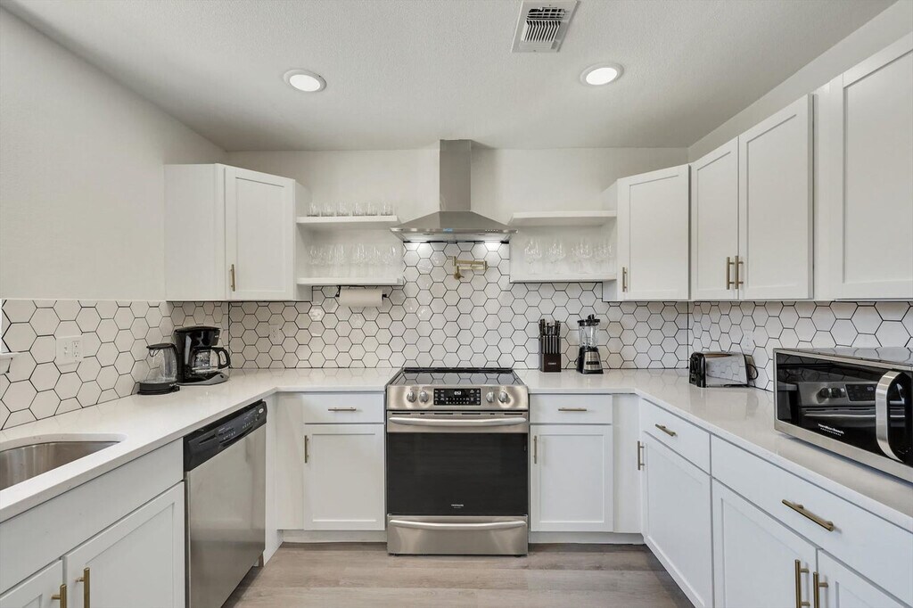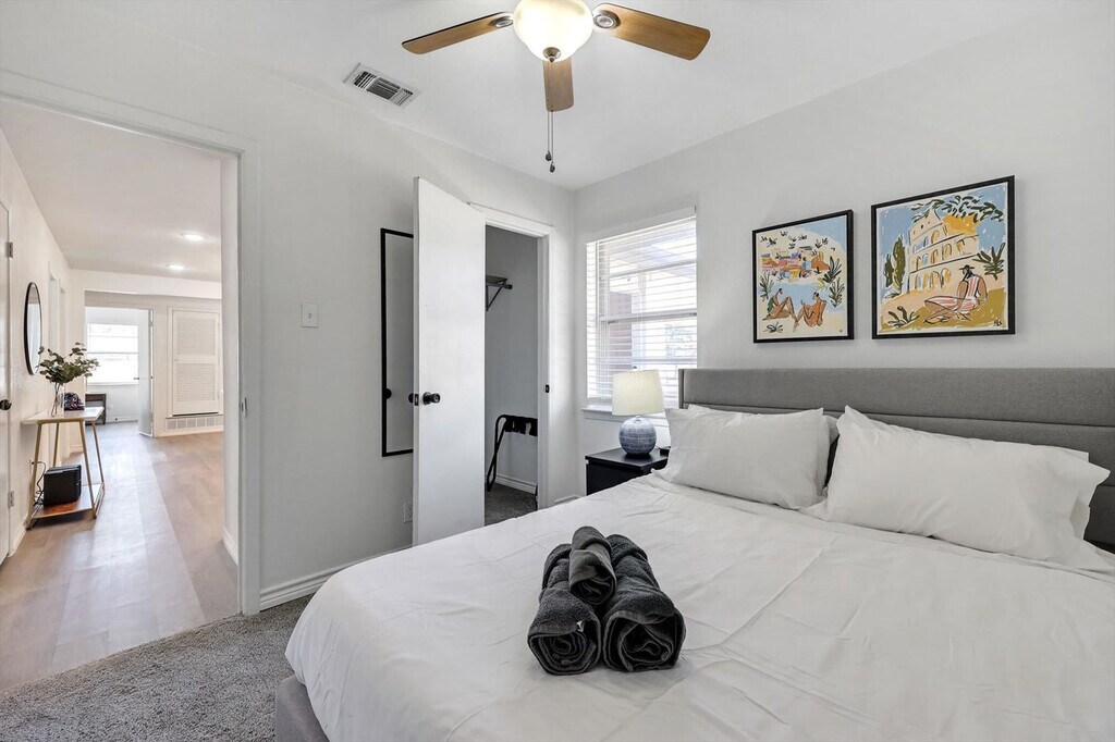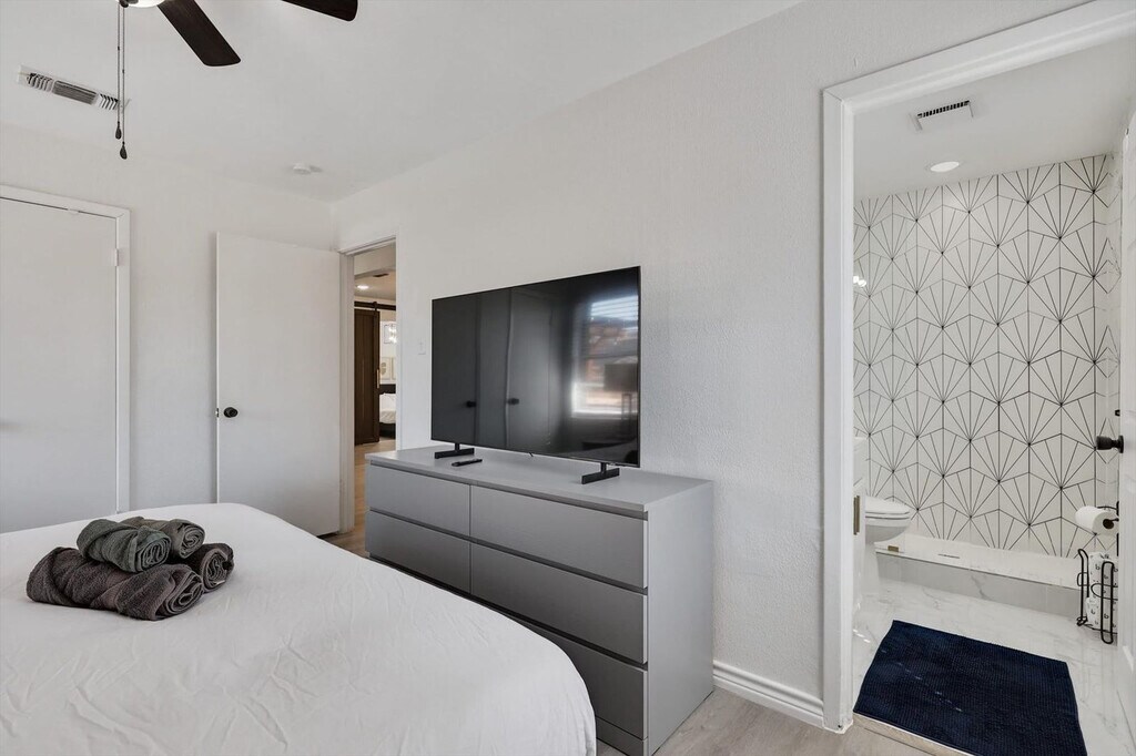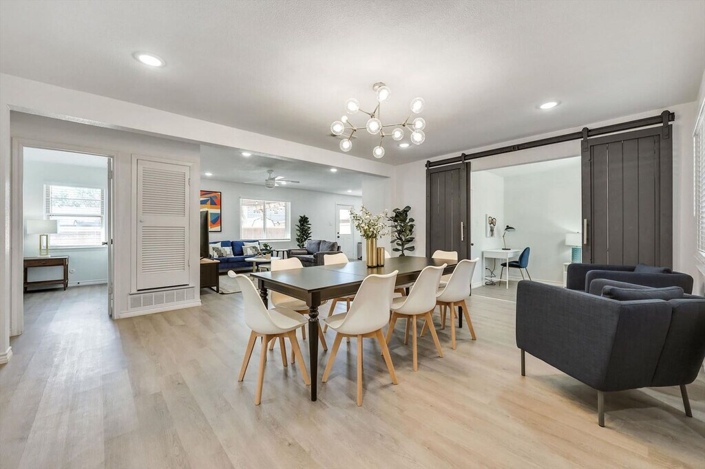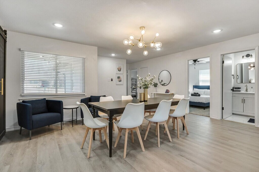 Feel at home in this stunning, recently remodeled 4-bedroom, 2-bathroom house in the heart of North Richland Hills. This masterpiece home features an open concept layout, an outdoor pool, and a beautiful pergola, perfect for entertaining. This home was remodeled with elegant touches, luxury finishes, and easy entertaining in mind. The fully equipped kitchen features stainless steel appliances, granite countertops, and ample counter space. There is a dining room table with seating for eight and a conversation nook for two. The living area offers two couches, a coffee table, a media console, a flat-screen TV, and high-speed Wi-Fi. The backyard includes an outdoor swimming pool, a hammock, loungers, a pergola, and a BBQ grill. A laundry room with a washer and dryer is available for your use. Free parking is available on the driveway as well as in the two-car garage. Our nightly rate includes the first six guests; with each additional guest, a $29/night fee will be applied. House-trained pets are welcome with a non-refundable pet fee of $150 per pet (maximum of 2 pets per stay). North Richland Hills is located in the suburbs of Dallas-Fort Worth. Nearby attractions include Iron Horse Golf Club, NRH2O Family Water Park, and Airborne Trampoline Park. Dallas-Fort Worth attractions include Six Flags Over Texas, CR Smith Museum, and AT&T Stadium. Dallas/Fort Worth International Airport is also nearby. Smoking of any type is not allowed; violations are subject to a $450 fine plus the cost to clean, deodorize, and repair damages. No parties or large unauthorized gatherings are allowed. Only registered guests are allowed on the property. No street parking is allowed due to City Parking Regulations. Registration Number: SFRENT-0725-2556 [SI]