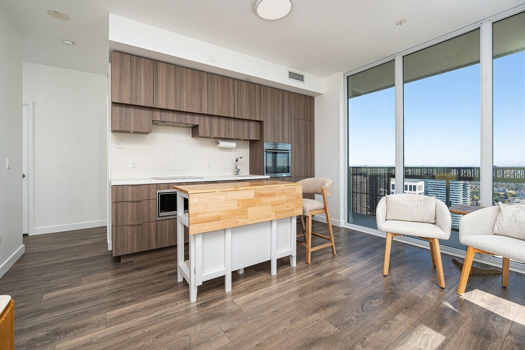 Rarely offered! Step into this tastefully furnished 2-plus-1 bedroom corner suite at the iconic E Condos and experience luxury living high above Yonge and Eglinton. Spanning 734 square feet plus a 257 square feet wraparound balcony, this sky-high retreat showcases floor-to-ceiling windows, 9-foot ceilings, and breathtaking unobstructed views. The bright, open-concept layout is ideal for entertaining, featuring a sleek European kitchen with integrated appliances, quartz counters, and hardwood floors throughout. Indulge in five-star amenities including a glass-walled pool, gym, yoga and boxing studios, party room, theatre, barbeque terrace, and 24-hr concierge. Direct indoor access to the subway and LRT, just steps from vibrant cafés, restaurants, and shops. Just pack your suitcase and get ready for your move! Available immediately - your Midtown dream home awaits!