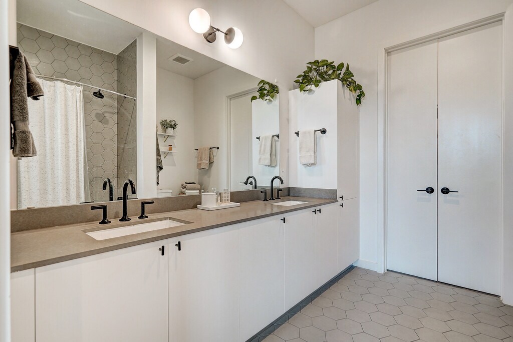 Welcome to 800 Embassy Drive #537—a stunning corner residence in one of Austin's premier high-rise condo towers, Tyndall at Robertson Hill. This fantastic two-bedroom, two-bathroom unit with a bonus room / study offers an expansive 1,344 square feet of modern living space, designed for a lock-and-leave lifestyle. Step into this impressive example of contemporary design, where floor-to-ceiling windows provide sweeping views of downtown, South Austin, and East Austin. Natural light floods the open-concept living and dining areas, highlighting the 10-foot ceilings and elegant hardwood floors throughout. The luxurious kitchen is a chef's dream, featuring new Cosentino countertops + quartz backsplash, premium state-of-the-art appliances, an eye-catching center island with modern lighting, and stylish cabinetry. Other recent updates include Vigo hardware in both the kitchen and bathrooms, as well as designer light fixtures throughout. The unit's flexible floor plan includes a versatile bonus room, perfect for a wellness space or home office. The primary suite offers a serene escape, featuring floor-to-ceiling hexagon marble tile in the bathroom, a frameless glass shower, and a spacious walk-in closet. The second bedroom is equally well-appointed, ensuring comfort and privacy for all. Enjoy the convenience of essential resort-like amenities, including a rooftop pool deck with skyline views, a state-of-the-art gym, impressive lounge spaces, grill stations, courtyards, grottos, and a dog park. The building also offers 24-hour concierge service, security, and on-site facility managers. Situated in an unbeatable location, Tyndall at Robertson Hill provides easy access to downtown, the airport, IH-35, and Austin's best bars and restaurants. Furnishings are negotiable, making this residence truly move-in ready. Includes one to two reserved garage spaces. Water + trash included. Don't miss the opportunity to make Tyndall #537 your new home in the heart of Austin.