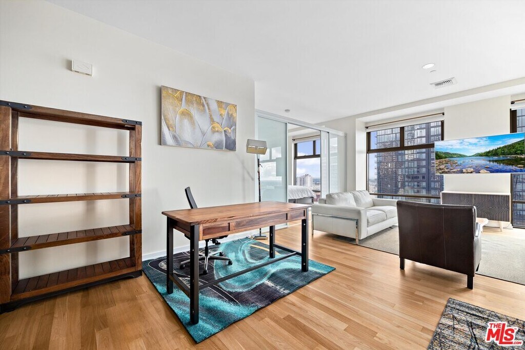 Experience elevated urban living in this sophisticated 3-bedroom, 3-bath residence perched on the 13th floor of Sky Lofts in the heart of Downtown Los Angeles. Designed for the discerning professional, this expansive corner unit seamlessly blends modern luxury with effortless functionality. Walls of glass frame sweeping city views, while soaring ceilings and rich hardwood flooring set the stage for a refined lifestyle. The open-concept living and dining area is perfect for entertaining, flowing into a beautifully appointed chef's kitchen featuring premium Bosch appliances, sleek quartz countertops, and custom European-style cabinetry. The flexible layout includes a spacious primary suite with a generous walk-in closet and spa-inspired bath, a private guest suite, and a third enclosed bedroom ideal for a home office, executive study, or media lounge. Each room is thoughtfully designed to offer comfort, privacy, and versatility. Additional features include in-unit laundry, central air, and two reserved parking spaces in a secure garage. Sky Lofts is a full-service building with 24/7 front desk concierge, fitness center, screening room, and stylish resident lounge. Located in South Park, you're moments from Whole Foods, fine dining, world-class entertainment at Arena, the Financial District, and major headquarters. Ideal for professionals, corporate leases, or anyone seeking an executive-caliber lifestyle in DTLA's most dynamic corridor. MLS# 25553891