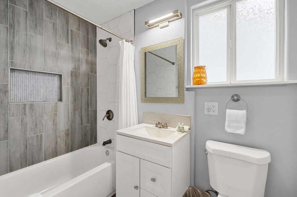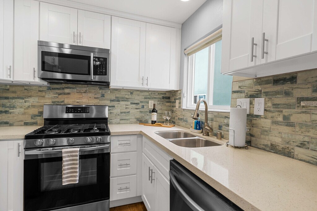 Feel at home in this newly renovated cottage, perfectly situated between the bay and Mission Beach. This classic, beachy duplex unit sleeps 4 and offers a modern, clean space. Beyond the well-designed interior, this apartment offers the ultimate in coastal convenience. Amenities include air conditioning, heat, a shared washer/dryer, high-speed internet, a bedside sound machine, and blackout curtains in the living room and bedroom. One garage parking space is included, which accommodates a standard size SUV (10ft wide, 18 feet deep, 6.5 feet tall). With its prime location between the ocean beach and Mission Bay, you’ll be immersed in the refreshing sea air and vibrant beach scene. This location is very walkable to restaurants, shops, rental stores and all the best beach spots. Mission Beach and Pacific Beach Boardwalk are steps away, as is Mission Bay. Belmont Park is walkable or a short drive away. San Diego International Airport is approximately 8 miles away, SeaWorld San Diego is approximately 2.8 miles away, Old Town San Diego is approximately 4.5 miles away, Downtown Gaslamp Quarter is approximately 8.4 miles away, and the San Diego Zoo is approximately 8.5 miles away. Occupants exceeding four will not be permitted to stay past 10 pm (children and infants are occupants). No more than 2 guests above the stated number of occupants in your reservation are allowed on the premises at any time. There is no smoking of any kind (tobacco, marijuana, hookah) on the property. The fine is $300. Please remove all trash and run the dishwasher before check out. This listing maintains a strict no-pet policy due to the owner's allergies. For your safety, there are outdoor cameras on the front door, back door, garage door, and inside the garage laundry area of the property. Registration Number: STR-01813L [SI]