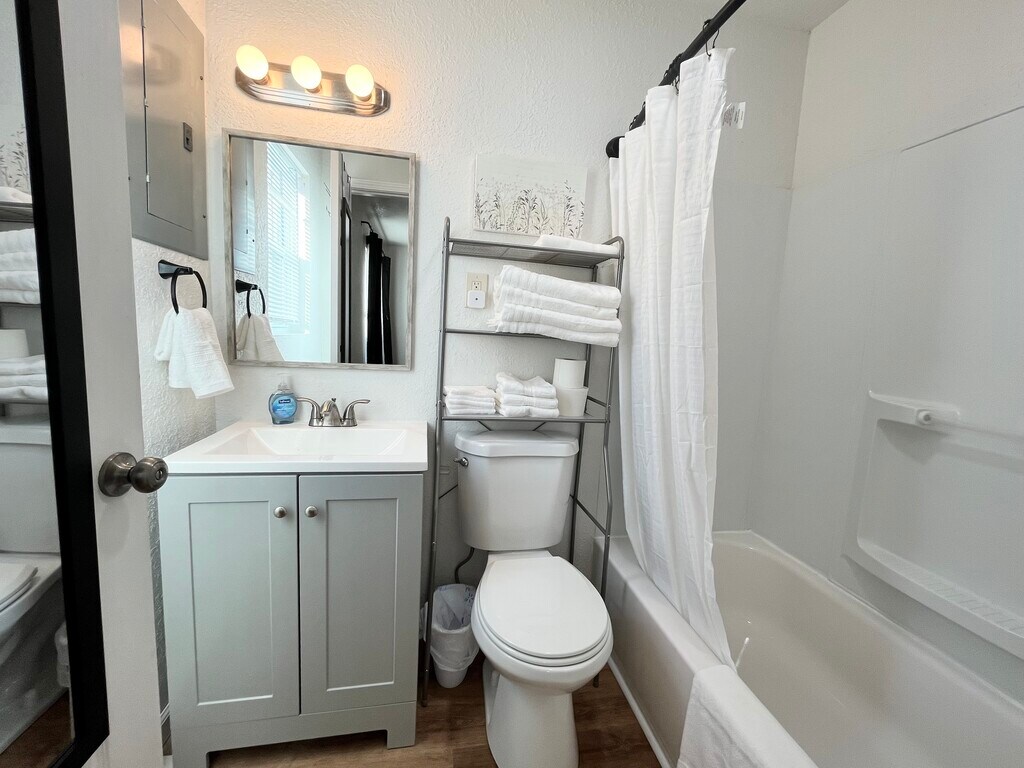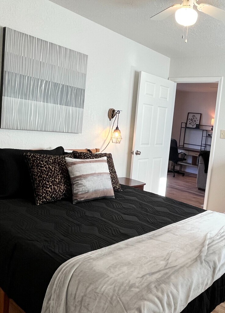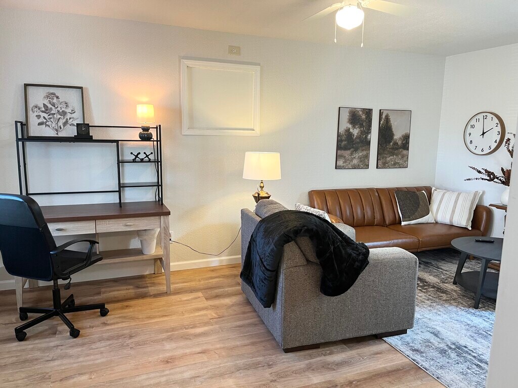 1-bedroom apartment completely remodeled and newly furnished with queen size bed, smart TV, fast wifi, and in-unit laundry. 1.1 miles away from ATSU and 0.3 miles from Truman State University. Hard surface dedicated well-lit parking lot. Shared fenced area for pet running around behind apartments. The living room couch also lays down to make a bed, and there’s a desk and office chair for getting work done. Pub style table in fully stocked kitchen. $300 monthly discount for year long lease!