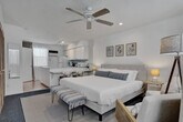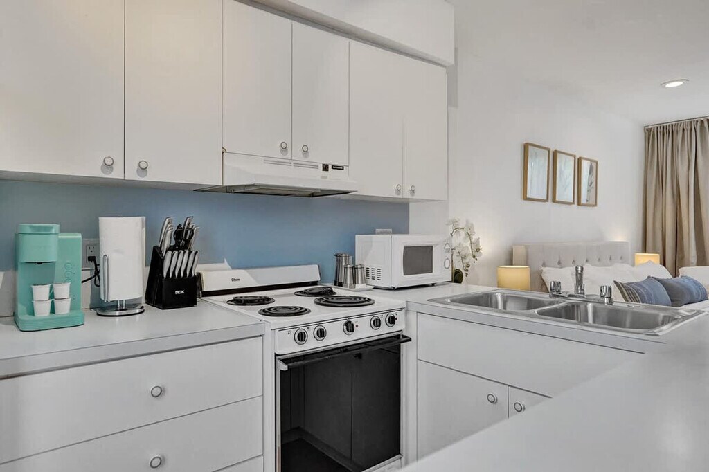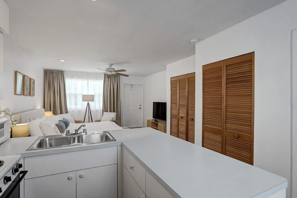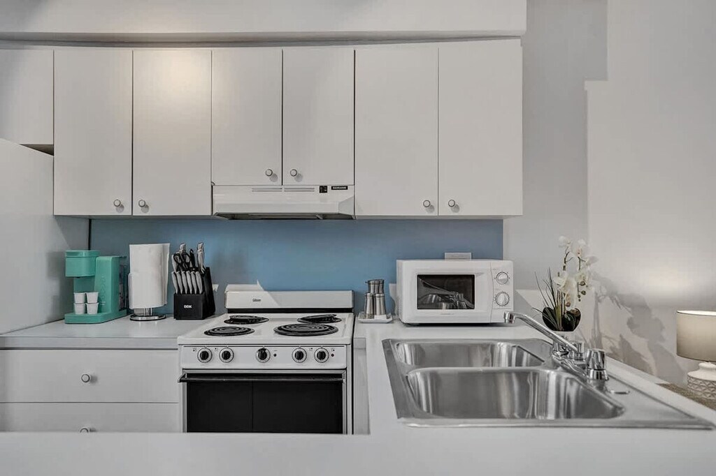 Relax and unwind at Marine Villas Hollywood in this newly renovated and spacious studio apartment, perfect for a getaway. Featuring a king-size bed and a cozy sitting area, you can enjoy a good book or a movie on the smart TV. The fully equipped kitchen includes a Keurig coffee machine, and there's a convenient laundry room on site. Enjoy outdoor activities like cooking on the BBQ in the garden, riding bikes on the Boardwalk, or surfing. The apartment is thoughtfully designed with modern furnishings and a fully equipped kitchen, ensuring you feel at home. Enjoy a coffee from the Keurig machine or unwind with a movie on the smart TV. For those rare rainy days, games and puzzles are available to keep you entertained. Parking is available with only one spot allowed due to limited space. If you wish to keep your vehicle parked after checking out and space permits, a $20.00 charge applies. Service dogs are welcome, but pets are not accepted, and a minimum $100.00 cleaning fee may be charged if a pet is found in the room. Located in the vibrant area of Hollywood Beach, the apartment offers easy access to the Boardwalk and nearby attractions. Enjoy the convenience of exploring the local area with bikes available for a ride along the scenic routes. Quiet time on Hollywood Beach is from 11:00 p.m. to 8:00 a.m. as per the Hollywood Noise Ordinance. A $250.00 fee will be charged for smoking in the rooms, and a $100.00 charge applies if the apartment is damaged or left excessively dirty. A $25 cleaning charge will be applied if the grill is not cleaned after use. Follow the checkout procedure provided at check-in, and ensure your room is left neat and tidy. Only registered guests are allowed to stay overnight, with a maximum of two persons in the studio. No candles are allowed for any reason.