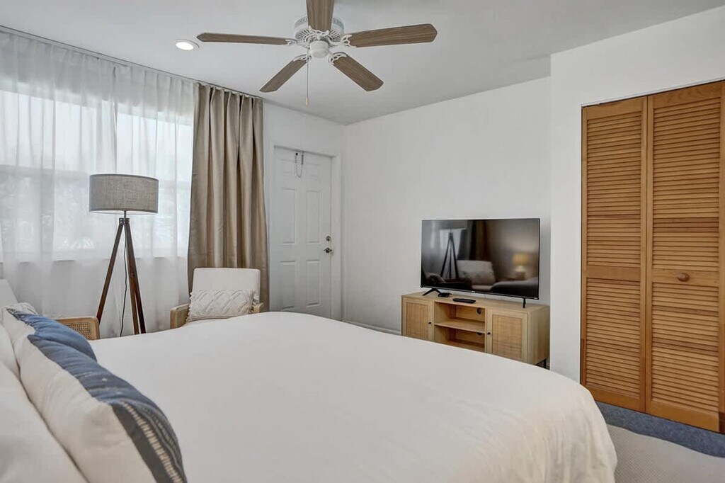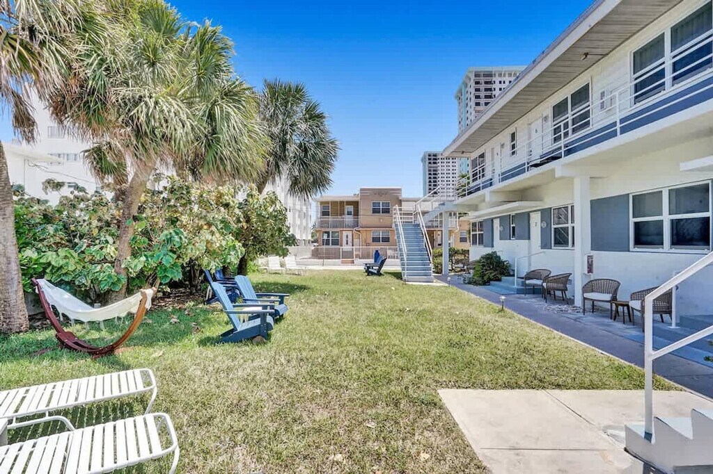Experience a relaxing getaway at Marine Villas Hollywood in this newly renovated studio apartment. Feel at home with a king-size bed and a cozy sitting area perfect for reading a good book. Enjoy the refreshing sea breeze and stunning views. The fully equipped kitchen includes a Keurig coffee machine, and there's a laundry room on-site. Take advantage of the BBQ in the garden, ride the Boardwalk on provided bikes, or try surfing. The apartment features a fully equipped kitchen with a Keurig coffee machine, allowing you to enjoy a fresh cup of coffee at your convenience. The on-site laundry room adds to the convenience, and the garden BBQ offers a delightful outdoor cooking option. Parking is limited to one spot per apartment, with an option to extend parking after check-out for a $20.00 fee, subject to availability. Located near Hollywood Beach, the apartment provides easy access to the Boardwalk, perfect for biking or leisurely strolls. Enjoy the vibrant local scene and nearby attractions, all within a short distance from your doorstep. Quiet hours on Hollywood Beach are from 11:00 p.m. to 8:00 a.m. Smoking is strictly prohibited inside the apartment, with a $250.00 fee for violations. Pets are not accepted, and a minimum $100.00 cleaning fee applies if a pet is found in the apartment. A $25 cleaning charge applies if the BBQ grill is not cleaned after use. A cleaning charge of at least $100.00 may be applied if the apartment is left excessively dirty or damaged. Service dogs are welcome but must be with you at all times and never left alone.