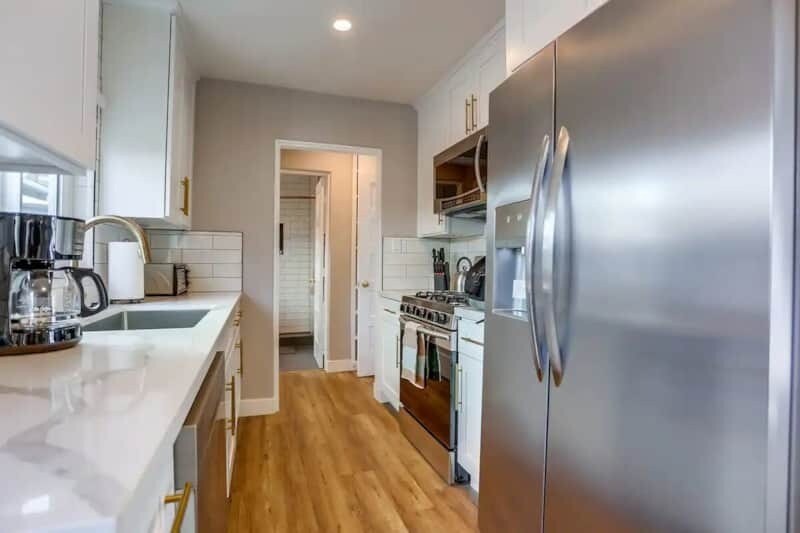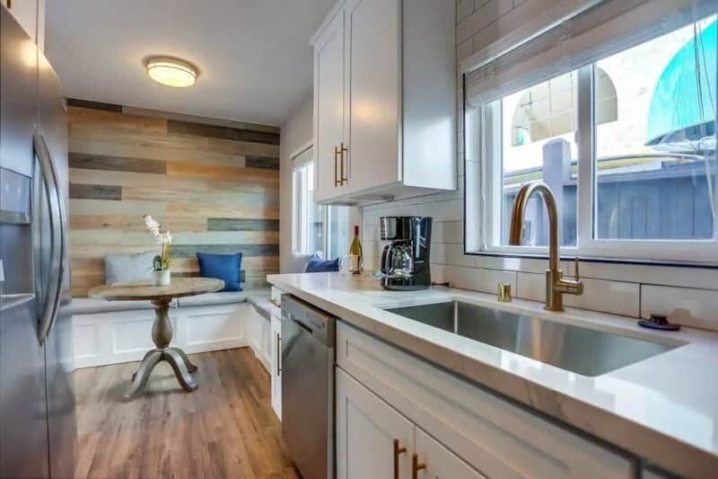 Modern, renovated 1-bedroom condo with bay views. Features AC, fully stocked kitchen, outdoor seating area with grill. Ideal location near Mission Bay, Belmont Park, and beach activities. Perfect for 2 adults. Amenities include Wi-Fi, cable TV, washer/dryer. Experience Mission Bay in style and comfort. Ideal for a romantic getaway or beach vacation.