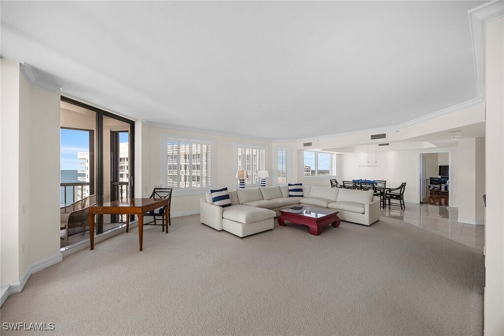 Available for 2027 at $35000 per month. Gulf and beach views from this high-floor corner residence directly on the beach in the private gated community of Bay Colony. Panoramic views of the Gulf of Mexico and coastline through hurricane-impact glass picture windows and floor-to-ceiling glass sliders throughout. A wraparound lanai offers multiple seating and dining areas to enjoy sunsets over the Gulf and views in every direction.This residence welcomes you into an entry foyer with wallcoverings and marble flooring. The living area features a coastal navy and white palette,crown moldings,plantation shutters,and built-in entertainment center. A separate dining area has Gulf views through oversized windows. The open kitchen with granite island,white cabinetry,and hardwood floors flows into a casual den with Gulf views.A private office with built-in bookshelves and sitting area provides work-from-home space with water views. The primary suite offers Gulf views and lanai access,with a bath featuring soaking tub,dual vanities,glass-enclosed shower,and walk-in closet. Two additional guest bedrooms each have en-suite baths with marble countertops and brass fixtures. Full laundry room with utility sink and extra storage at lobby level. The Carlysle amenities include a lobby with 24-hour staffed front desk,two guest suites,fitness center,social rooms and a resort-style pool. Bay Colony residents enjoy the use of their private beach club and restaurant,a tennis club,as well as use of amenities of Pelican Bay.