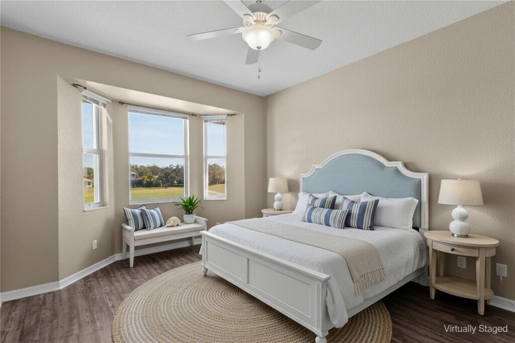 Beautiful ANNUAL RENTAL opportunity in gorgeous Stoneybrook at Heritage Harbour: 2-bedroom,2-bath FIRST FLOOR condo offering nearly 1,250 sq. ft. of comfortable living space. This well-maintained home features NEW luxury vinyl flooring in the main living area and both bedrooms,eliminating carpet hassle. The bright living room and breakfast nook open to the screened lanai with a stunning golf course view - perfect for relaxing and enjoying Florida weather. Thoughtful details throughout include ceiling fans with lights in both bedrooms and the living room,new blinds,real-wood kitchen cabinets,and stainless-steel appliances. The split layout offers excellent privacy. The primary suite features a spacious walk-in closet and en-suite bathroom with a large shower and extended countertop. The laundry closet is conveniently equipped with a full-size washer and dryer. Stoneybrook at Heritage Harbour is a gated resort-style community located approximately 17 miles from Anna Maria Island and close to SR 64,Costco,and the Lakewood Ranch area. Enjoy an abundance of amenities,including a Mediterranean-style clubhouse with a fitness center,community pool and spa,tennis and pickleball courts,basketball and sand volleyball,and a playground. Beautiful landscaping,mature trees,serene lakes,and well-maintained buildings create a peaceful and welcoming atmosphere. Make this lovely condo your next home and enjoy comfort,convenience,and an incredible community lifestyle. MLS# A4673484