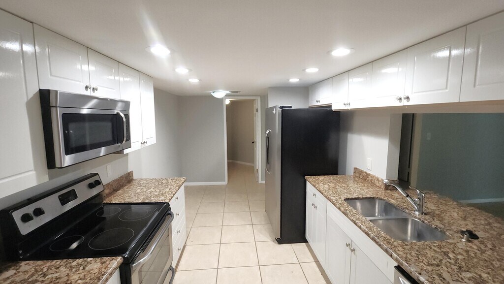 Rare Opportunity! Discover this charming 1-bedroom corner unit in desirable East Delray -- with no neighbors for added privacy and tranquility. Just minutes from the beach, vibrant Atlantic Avenue, and an abundance of shopping and dining options. Walk to Whole Foods, Target, Starbucks, and more -- plus Total Wine is coming soon! Step inside to find a freshly painted interior with elegant tile flooring throughout & warm wood floors in the bedroom. The updated kitchen features sleek stainless steel appliances and modern white cabinetry, new electric blinds being installed. Enjoy Florida living on your spacious renovated wraparound stone-tile balcony, offering peaceful partial lake views -- a perfect spot for morning coffee or evening relaxation. Additional highlights include a full-size washer