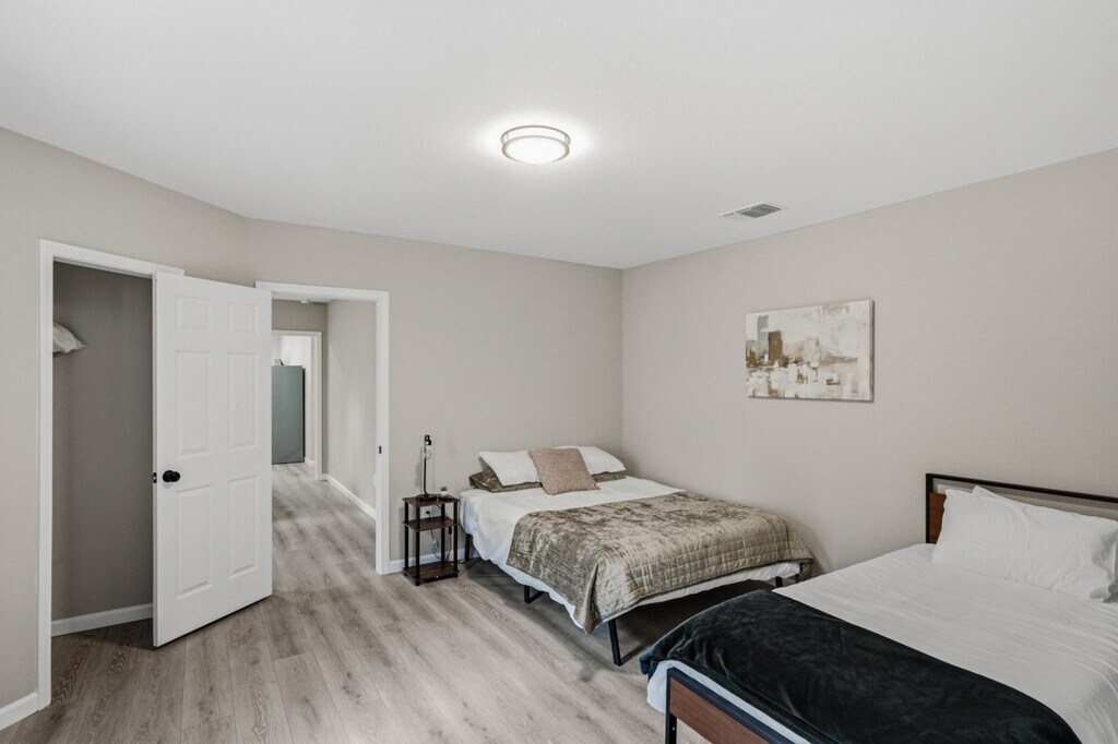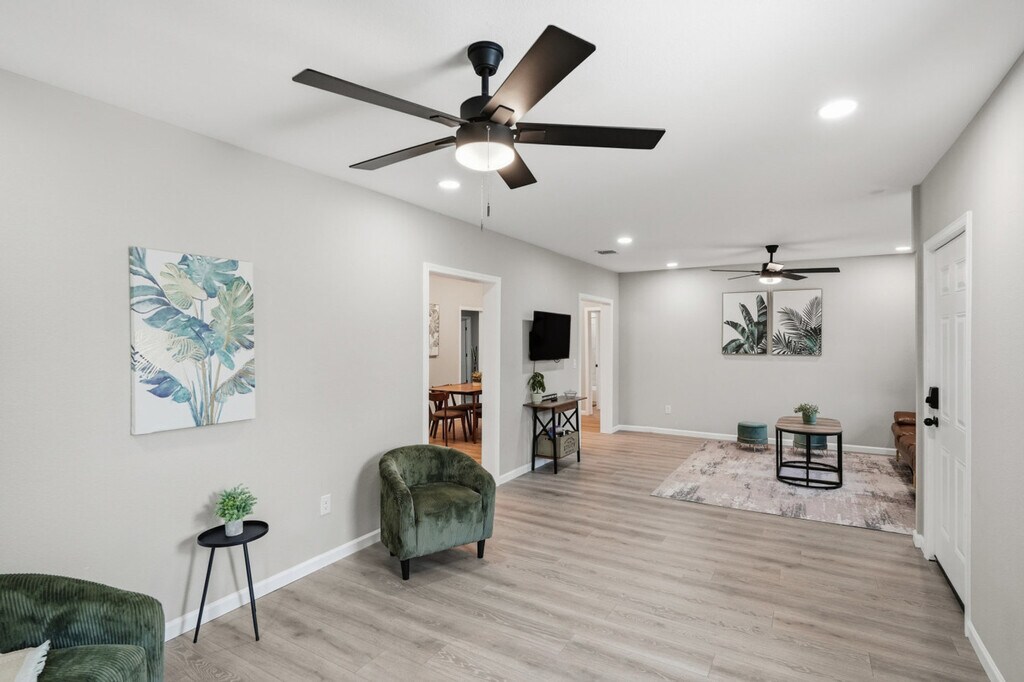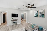 Experience comfort and style in this spacious 4-bedroom home located just minutes from downtown San Antonio. Feel at home in this bright, open layout. This home features a full kitchen with stainless steel appliances and cookware, central HVAC for year-round comfort, and smart TVs throughout. The living room offers comfortable seating, and the dining area is perfect for shared meals or game nights. Enjoy the convenience of a private entrance and off-street parking steps from the front entrance. High-speed Wi-Fi is available for streaming and remote work. Located in the historic Highland Park / Denver Heights area, the neighborhood offers a peaceful residential feel with easy access to downtown San Antonio. You’ll find local eateries, coffee shops, and groceries nearby, and iconic attractions like the River Walk and the Alamo within minutes. Getting around is simple with major roads and transit nearby. Downtown San Antonio and the River Walk are about a 10-minute drive. The nearest grocery (H-E-B) is approximately a 4-minute drive or a 15-minute walk. The bus stop is approximately a 5-minute walk. Another separate unit is located at the rear of the property, fully divided to ensure privacy during your stay. Guests have full and private access to the entire front unit, which includes all four bedrooms, two bathrooms, a kitchen, dining area, and living room. The unit has its own separate entrance and parking. Rideshare services like Uber and Lyft are readily available. [SI]