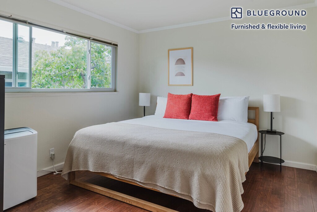 Feel at home wherever you choose to live with Blueground. You’ll love this pretty University South furnished two bedroom apartment with its modern decor, fully equipped kitchen, and bright living room. Ideally located, you’re close to all the best that Palo Alto has to offer! (ID #SFO1733) The advertised rate of $5,880/month is the lowest available price, based on a 12 month(s) stay with a move-in date of March 15, 2026. Rates vary depending on the duration of stay, season, and other parameters. For exact pricing and additional pricing components, please visit our website and enter your desired move-in and move-out dates. The rate is applicable when billed upfront; it can be higher if billed in multiple payments. Brokers are welcome to reach out. Were you looking for an unfurnished lease? Try Blueground instead and upgrade from unfurnished to furnished living: - Furnished at rates comparable to unfurnished - No setup or furniture costs - save thousands - Move-in ready - save time, just bring your suitcase Designed with you in mind Gorgeous furniture, fully equipped kitchen, smart TV, and a premium wireless speaker are just a few of the amenities you’ll find inside this two bedroom apartment. Ideally located in Palo Alto, you’ll find a lot to love outside as well. When you’re ready to relax, you’ll be happy to discover every Blueground bedroom comes with superior quality mattresses, luxury linens, and cozy towels. We handle everything so you can simply show up and start living. Sleeping arrangements King Bed, 70.8in/180cm King Bed, 70.8in/180cm Amenities Building amenities unique to this two bedroom apartment include an on-site: - Dryer in building - Washing machine in building - Parking Arrival and ongoing support The entire apartment is yours to enjoy! Throughout your stay, you’ll have access to our Client Experience team through the Blueground App. You can schedule additional cleanings, submit maintenance requests, and view our neighborhood recommendations with just a few taps. We’ll share all details upon confirmation of your stay. Other things to note Building amenities may have an extra cost. This Blueground apartment has flexible lease options, allowing you to book it for one month, a year, or more. Parking is offered based on availability and is subject to a fee. Please keep in mind that this is a walk up building. We take great pride in ensuring every photo displayed is shot in our own units with our actual furnishings. That said, we regularly refresh our decor and furniture arrangement, which may differ from what’s pictured. Also note - The building's communal garden is accessible to all tenants - There are stairs leading up to the entrance of this apartment, but no elevator [SI]