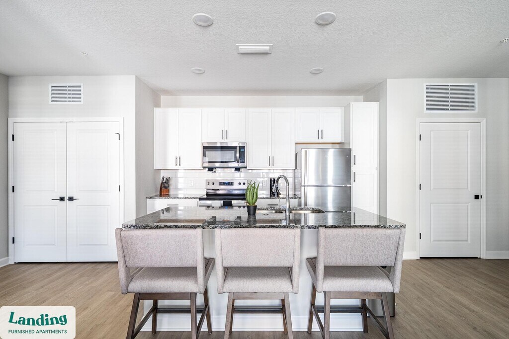 Landing offers flexible lease terms from weeks to months. Please always visit our website or contact us for the latest pricing & availability. Stay longer, save more: 6-Month Minimum base rent: starts at $2081/mo 12-Month Minimum base rent: starts at $2030/mo Landing offers flexible leases across a network of over 35,000 fully-furnished apartments throughout 375+ cities so you can rent on your terms, practically anywhere, and avoid the hassle of paying deposits or application fees. Visit to learn about all the benefits of a Landing membership, see our competitive up-to-date pricing, explore available apartments, take virtual tours, and make reservations online without jumping through traditional rental hoops. Landing's apartments at Palm Breeze Apartments are designed for comfortable, easy living, with the ability to stay as long as you like. Experience living with Landing Every apartment is outfitted with all the modern essentials including: custom-designed furnishings, a fully-equipped kitchen with deluxe stainless steel appliances, a gourmet coffee maker, premium linens, Smart TVs, and incredibly fast, reliable internet for working from home. When you live with Landing, you'll enjoy a hassle-free experience with the added benefit of 24/7 access to our dedicated member experience team. Some of the nitty-gritty: a background check and proof of income are required; we're completely smoke-free; bundled utility packages and pricing vary based on length of stay; pet-friendly options available; listed price reflects a 12-month minimum stay.