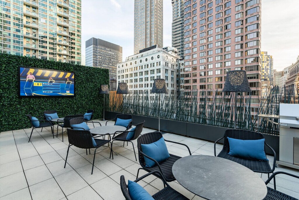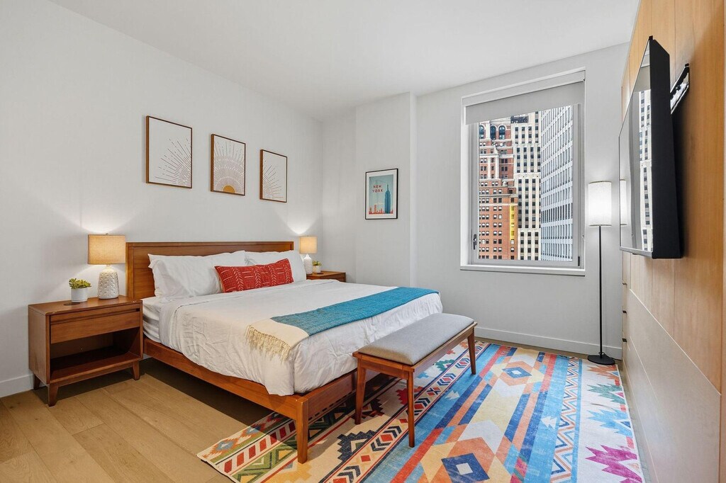 Feel at home in this studio, situated in the heart of FiDi. The kitchen is equipped with both a Keurig and Nespresso machine, as well as an induction stovetop and a dual microwave/convection oven. The unit also features two smart TVs and an Apple TV. Amenities include a washer and dryer on site, coffee maker, stocked kitchen, dishwasher, fitness center, landscaped rooftop terrace with outdoor media, and indoor roof lounge. Only a 5-minute walk to the WTC station and 9/11 memorial, there is no shortage of restaurants in this area, and the historic Seaport is within walking distance. Fulton Station with access to most lines is nearby, and it's only 13 minutes on the subway to Park Slope, Brooklyn, and 12 minutes to Union Square. The Howell is within walking distance of numerous 24-hour drugstores and all the student life around Pace University. The NYSE on Wall Street is only a few blocks away. Catch dinner at Brookfield Place with views of the Statue of Liberty close by or admire the view from the One World Observatory. Internet speeds are not guaranteed and may fluctuate based on your computer model and the router location. There is no parking at this property. Early check-in from 9 am-3 pm will incur a fee of $75. Early check-in before 9 am will incur a fee of one full night's rent (based on selected dates). Late check-in after 8 pm will incur a fee of $75. Late check-out from 11 am-3 pm will incur a fee of $75. Late check-out after 3 pm will incur a fee of one full night's rent (based on selected dates). Includes private high-speed internet, standing desk (Uplift), work chair (Uplift), 34-inch ultra-wide monitor (Samsung), microphone (Blue Yeti), webcam (Logitech), computer speakers (Logitech), key light, monitor light, green screen, keyboard (Logitech), mouse (Logitech), and TOTU 16-in-1 Triple Display USB-C 3.1 docking station. [SI]