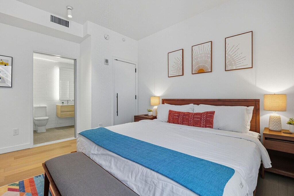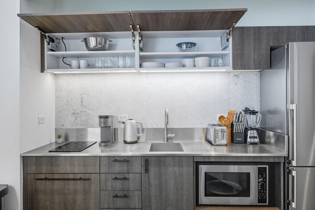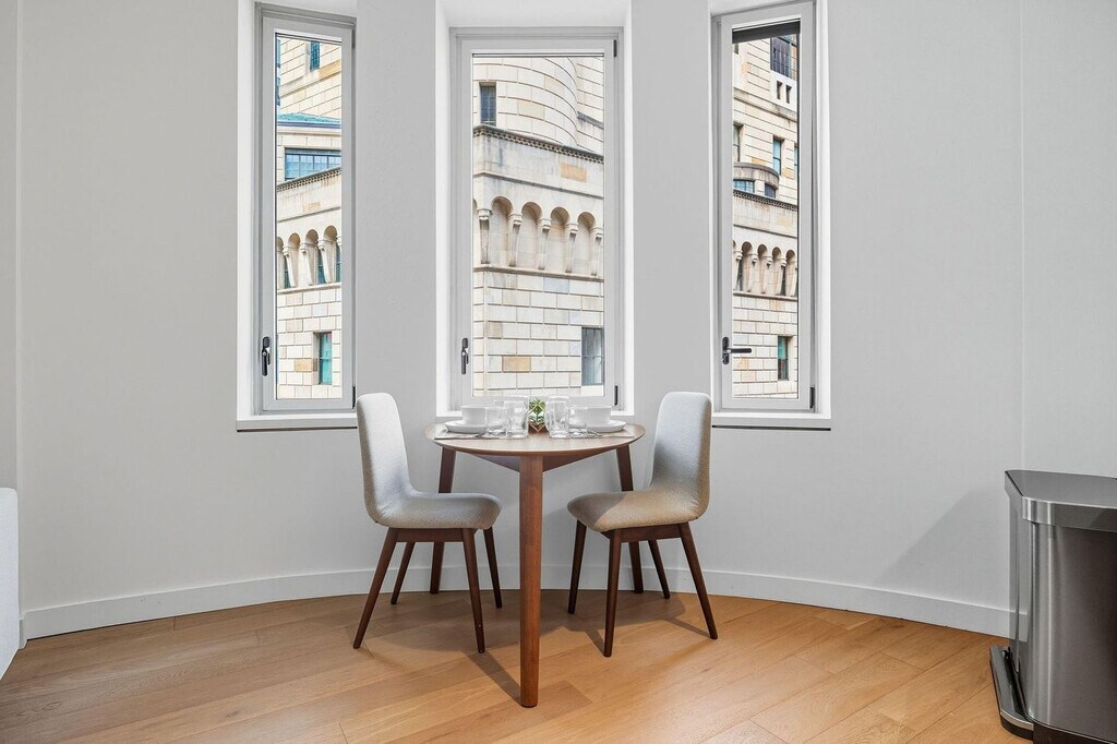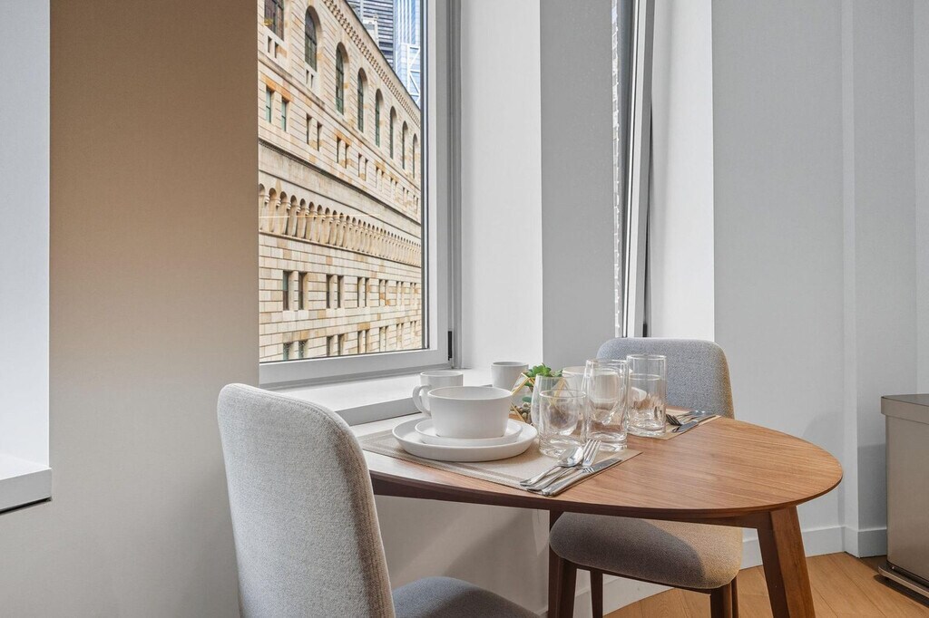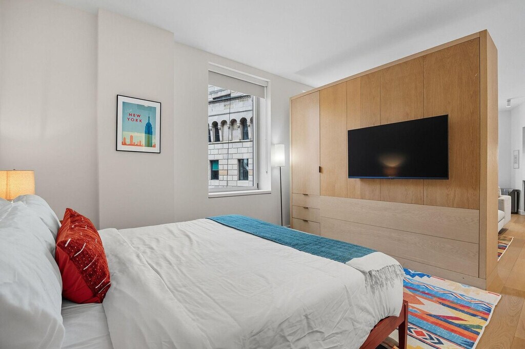 Feel at home in this studio, situated in the heart of FiDi. The kitchen is equipped with both a Keurig and Nespresso machine, as well as an induction stovetop and a dual microwave/convection oven. This unit also features two smart TVs and an Apple TV. Amenities include a washer and dryer on site, coffee maker, stocked kitchen, dishwasher, fitness center, landscaped rooftop terrace with outdoor media, and an indoor roof lounge. Only 5 minutes walk to the WTC station and 9/11 memorial, there is no shortage of restaurants in this area, and the historic Seaport is within walking distance. Fulton Station with access to most lines is nearby, and it's only 13 minutes on the subway to Park Slope, Brooklyn, and 12 minutes to Union Square. The Howell is within walking distance of numerous 24-hour drugstores and all the student life around Pace University. The NYSE on Wall Street is only a few blocks away. Catch dinner at Brookfield Place with views of the Statue of Liberty close by or admire the view from the One World Observatory. Internet speeds are not guaranteed and may fluctuate based on your computer model and the router location. A laptop computer is not included. There is no parking at this property. Early check-in from 9 am-3 pm will incur a fee of $75. Early check-in before 9 am will incur a fee of 1 full night's rent (based on selected dates). Late check-in after 8 pm will incur a fee of $75. Late check-out from 11 am-3 pm will incur a fee of $75. Late check-out after 3 pm will incur a fee of 1 full night's rent (based on selected dates). Includes private high-speed internet, standing desk (Uplift), work chair (Uplift), 34-inch ultra-wide monitor (Samsung), microphone (Blue Yeti), webcam (Logitech), computer speakers (Logitech), key light, monitor light, green screen, keyboard (Logitech), mouse (Logitech), and TOTU 16-in-1 Triple Display USB-C 3.1 Docking Station. [SI]